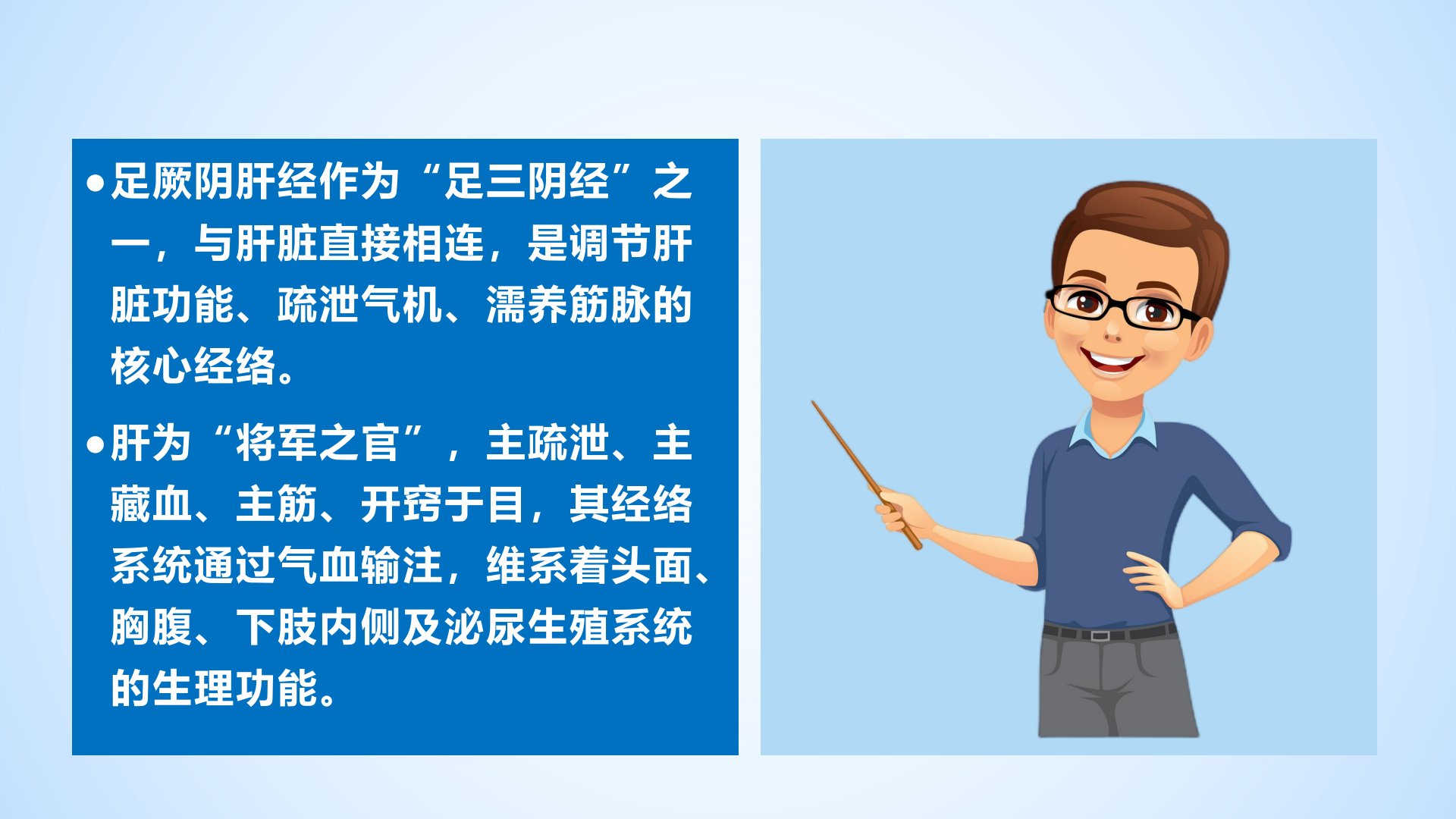 第十四章足厥阴经络与腧穴第一节概述足厥阴肝经作为“足三阴经”之一,与肝脏直接相连,是调节肝脏功能、疏泄气机、濡养筋脉的核心经络。肝为“将军之官”,主疏泄、主藏血、主筋、开窍于目,其经络系统通过气血输注,维系着头面、胸腹、下肢内侧及泌尿生殖系统的生理功能。本节内容分为两大模块:足厥阴经络与足厥阴腧穴。其中,足厥阴经络包括经脉、络脉、经别、经筋四部分,构建肝脏与体表的气血通路;足厥阴腧穴起于足大趾末端的大敦穴,止于胸部的期门穴,左右各14穴,涵盖足部、下肢内侧、腹部、胸部,既是反映肝脏及相关脏腑病症的“信号点”,也是临床调理肝病、筋病、生殖病症的核心“作用点”,尤其在情志失调、月经不调、目疾调理中...