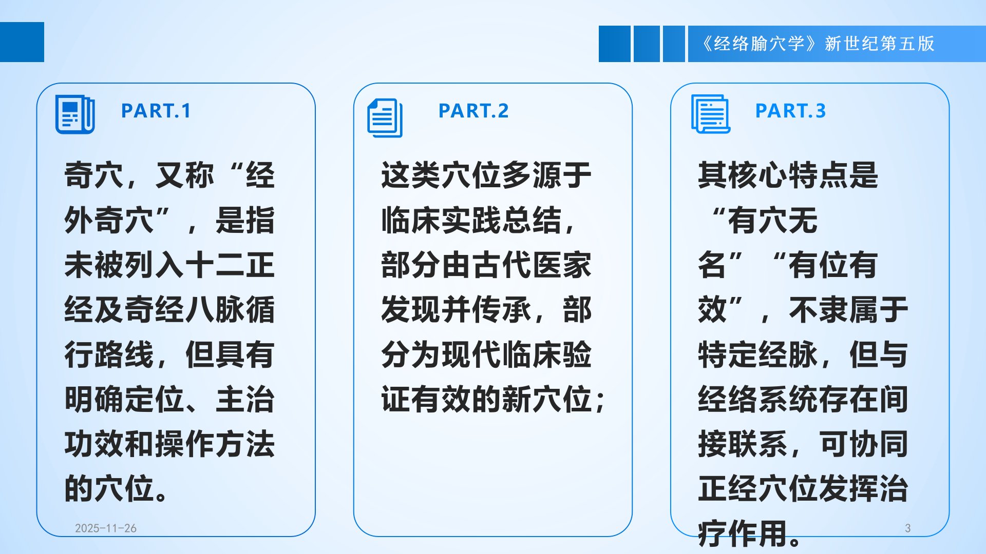 第十六章奇穴第一节概述奇穴,又称“经外奇穴”,是指未被列入十二正经及奇经八脉循行路线,但具有明确定位、主治功效和操作方法的穴位。PART.1这类穴位多源于临床实践总结,部分由古代医家发现并传承,部分为现代临床验证有效的新穴位;PART.2其核心特点是“有穴无名”“有位有效”,不隶属于特定经脉,但与经络系统存在间接联系,可协同正经穴位发挥治疗作用。PART.3奇穴的主要特点的包括三点:1.定位明确:均有固定的解剖标志或骨度分寸定位方法,可精准取穴;2.主治专一:多针对某一类特定病症,如胆囊穴治胆系疾病、阑尾穴治阑尾炎,疗效针对性强;3.操作规范:有明确的针刺深度、角度或艾灸要求,部分穴位需特殊操...
