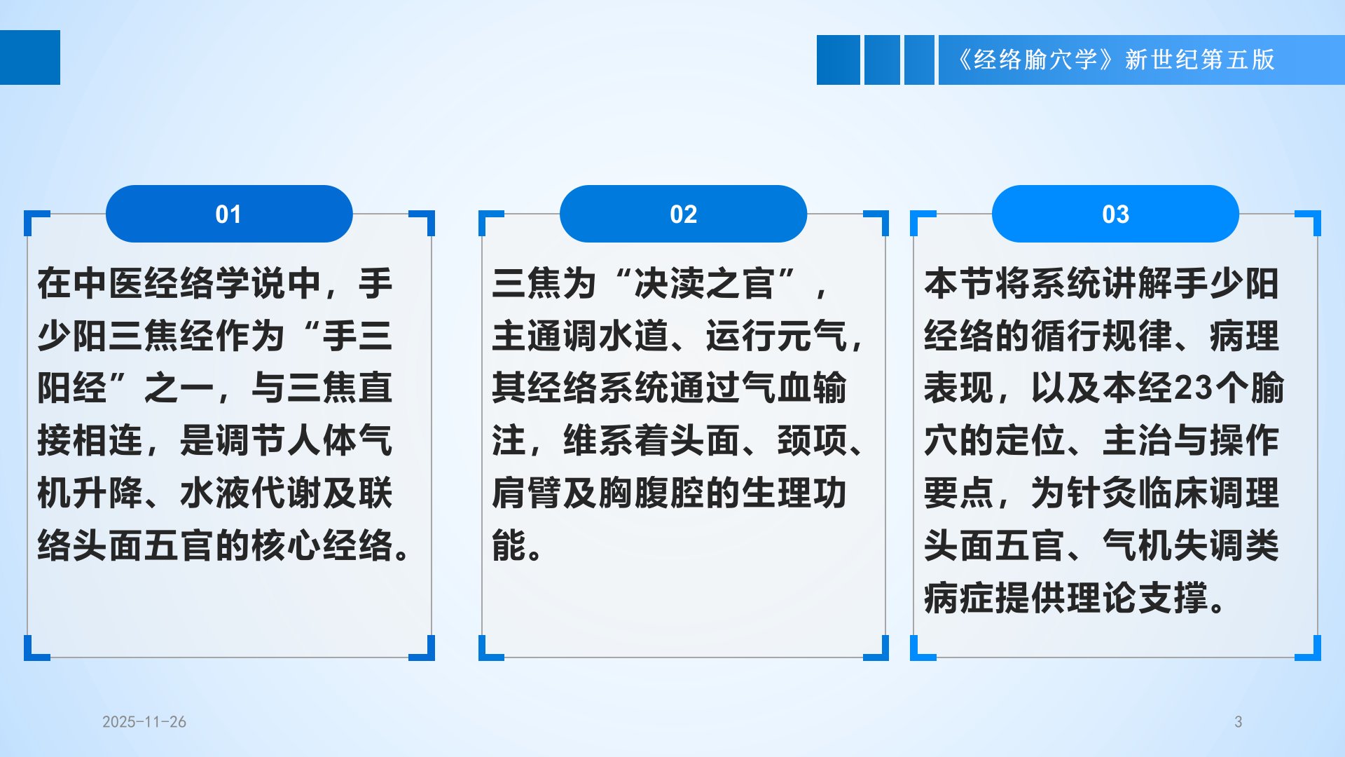 第十二章手少阳经络与腧穴第一节概述在中医经络学说中,手少阳三焦经作为“手三阳经”之一,与三焦直接相连,是调节人体气机升降、水液代谢及联络头面五官的核心经络。01三焦为“决渎之官”,主通调水道、运行元气,其经络系统通过气血输注,维系着头面、颈项、肩臂及胸腹腔的生理功能。02本节将系统讲解手少阳经络的循行规律、病理表现,以及本经23个腧穴的定位、主治与操作要点,为针灸临床调理头面五官、气机失调类病症提供理论支撑。03本节内容分为两大模块:手少阳经络与手少阳腧穴。其中,手少阳经络包括经脉、络脉、经别、经筋四部分,共同构成三焦经气血运行的通路;手少阳腧穴起于无名指末端的关冲穴,止于眉梢的丝竹空穴,左右...