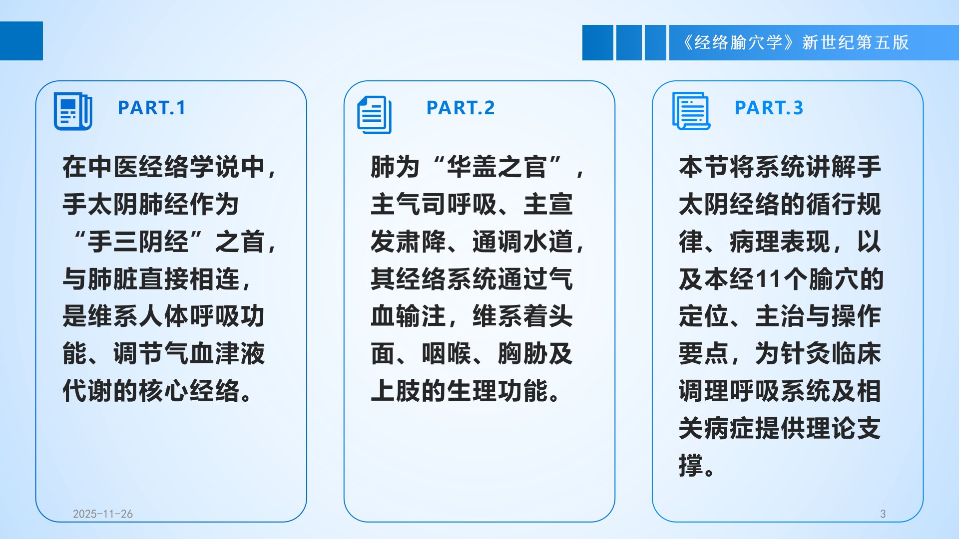 第三章手太阴经络与腧穴摘要第三章详述了手太阴肺经作为“手三阴经”之首与肺脏直接相连维系人体呼吸、调节气血津液代谢的核心作用。内容分为两大模块:手太阴经络与手太阴腧穴。一、手太阴经络1经脉:循行贯穿胸腹、上肢与手部联系肺、大肠等脏腑。病候分“是动则病”(气血逆乱证)与“是主肺所生病者”(脏腑功能失调证)及气血盛衰的不同表现。2络脉:分支沟通肺经与大肠经列缺穴为络穴调理头项、呼吸道病症。3经别:深入体内分支加强肺与大肠、喉咙联系。4经筋:分布于手部、上肢内侧、胸部主肢体运动与胸部气机稳定。二、手太阴腧穴共11穴分胸前外上部穴与上肢掌面桡侧穴主治多与肺经循行、肺主气功能相关。1胸前外上部穴:中府(肺募穴)、云门主治呼吸系统及局部肩背痛。2上肢掌面桡侧穴:天府、侠白、尺泽(合穴)、孔最(郄穴)、列缺(络穴、八脉交会穴)、经渠(经穴)、太渊(输穴、原穴)、鱼际(荥穴)、少商(井穴)各穴主治呼吸系统、头面五官、局部及全身病症部分为急救与热证、头项疼痛、小儿病症要穴。操作时需注意针刺深度与方向避免伤及重要器官与血管。
