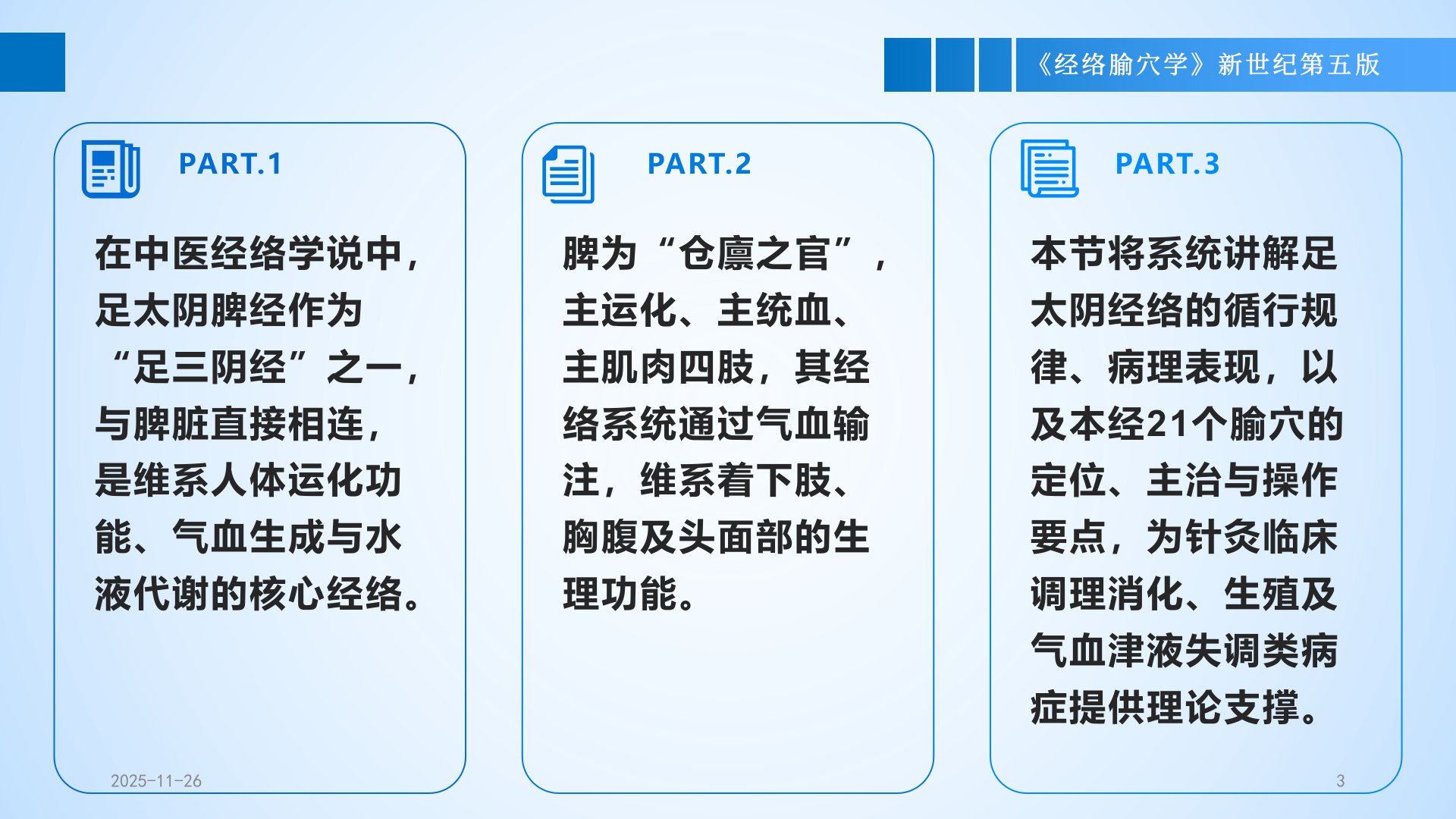第六章足太阴经络与腧穴第一节概述在中医经络学说中,足太阴脾经作为“足三阴经”之一,与脾脏直接相连,是维系人体运化功能、气血生成与水液代谢的核心经络。PART.1脾为“仓廪之官”,主运化、主统血、主肌肉四肢,其经络系统通过气血输注,维系着下肢、胸腹及头面部的生理功能。PART.2本节将系统讲解足太阴经络的循行规律、病理表现,以及本经21个腧穴的定位、主治与操作要点,为针灸临床调理消化、生殖及气血津液失调类病症提供理论支撑。PART.3本节内容分为两大模块:足太阴经络与足太阴腧穴。其中,足太阴经络包括经脉、络脉、经别、经筋四部分,共同构成脾经气血运行的通路;足太阴腧穴起于大趾末端的隐白穴,止于侧胸...