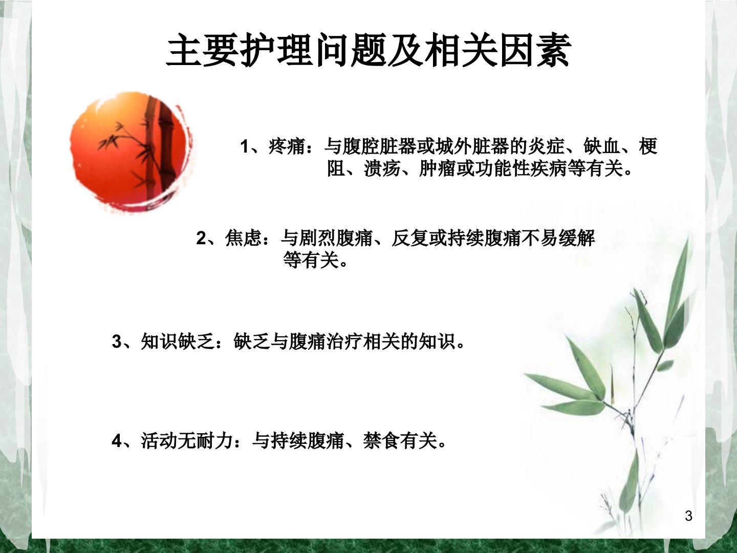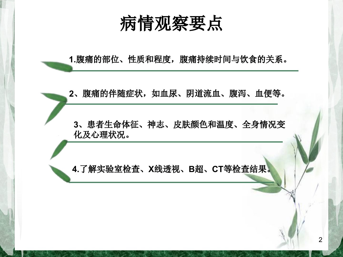 腹痛护理常规摘要病情观察要点1观察腹痛部位、性质、程度、持续时间及与饮食关系。2注意伴随症状如血尿、阴道流血等。3监测生命体征、神志、皮肤颜色温度及全身、心理状况变化。4了解实验室及各项影像检查结果。主要护理问题及相关因素1疼痛:与多种脏器病变或功能性疾病有关。2焦虑:因剧烈、反复或持续腹痛引起。3知识缺乏:缺乏腹痛治疗知识。4活动无耐力:持续腹痛、禁食导致。护理措施1了解疼痛特点观察患者反应及生命体征。2保持患者体位舒适烦躁者防坠床。3选择非药物性缓解疼痛的方法。4遵医嘱选择性给药观察不良反应急性剧烈腹痛诊断未明慎用镇痛药。5诊断未明时一般禁食必要时胃肠减压。6加强心理护理重点沟通了解病情。健康指导1心理疏导减轻恐惧焦虑树立信心。2生活规律注意饮食卫生活动期卧床休息。3针对病因教预防方法调节情感避免不良刺激。