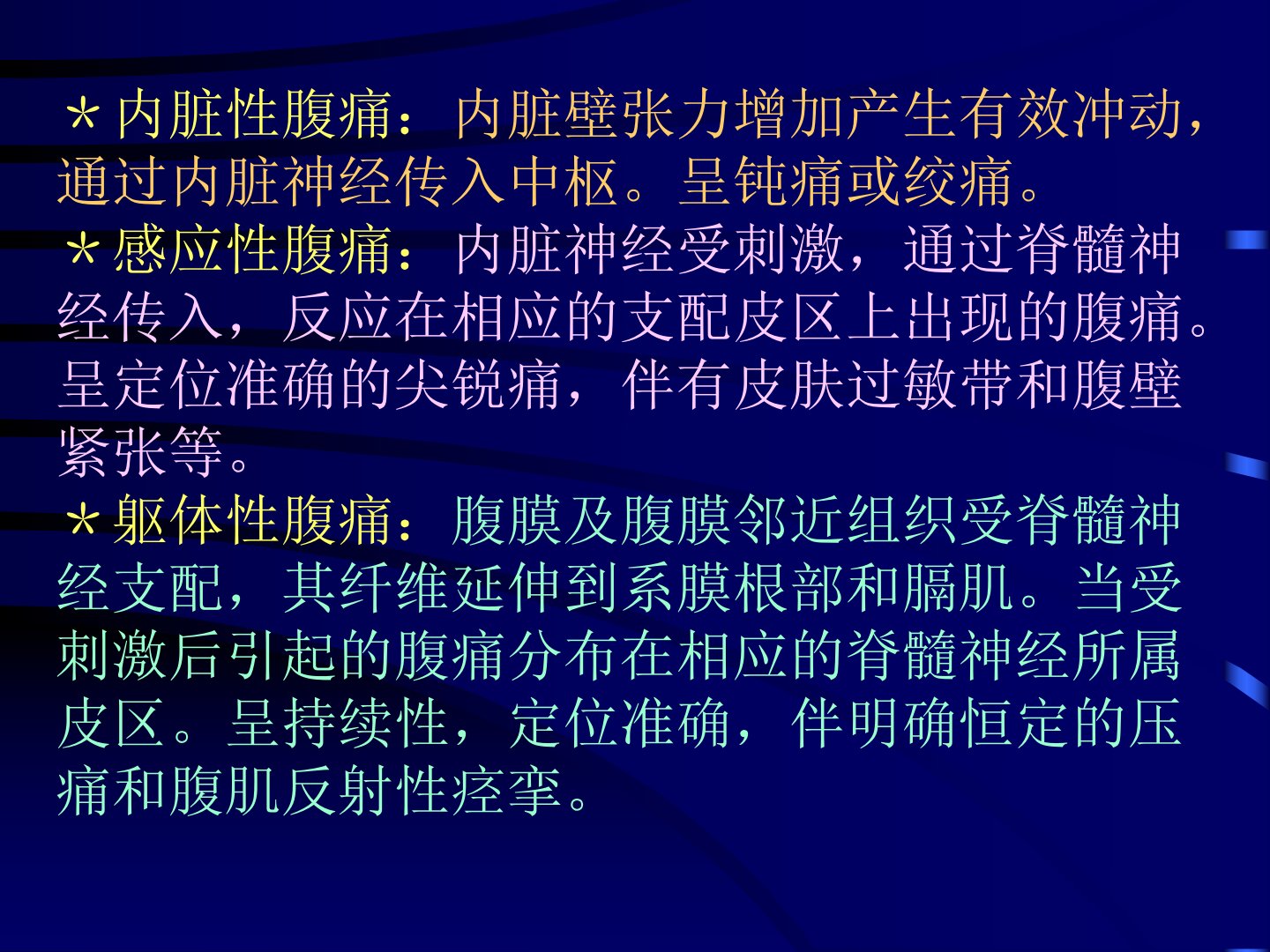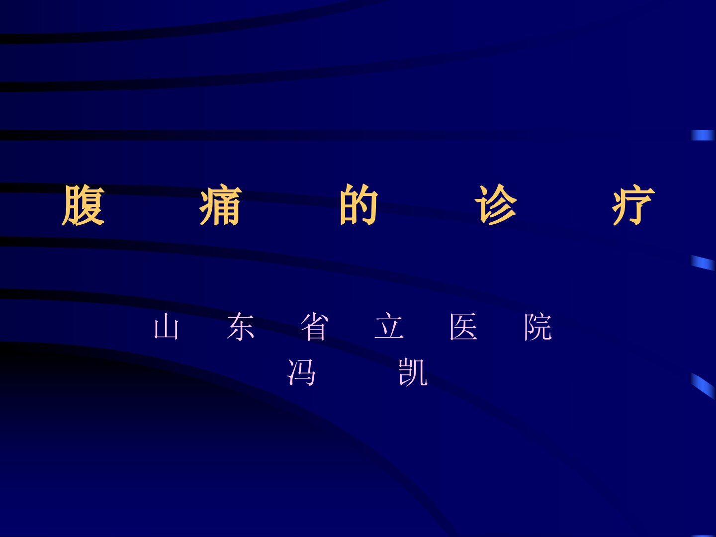 腹痛的诊疗摘要本文是山东省立医院冯凯医生关于腹痛诊疗的综述。腹痛由腹腔内外脏器病变引起分急性和慢性两类病因复杂包括炎症、梗阻、肿瘤等。腹痛类型有内脏性腹痛(钝痛或绞痛)、感应性腹痛(尖锐痛)和躯体性腹痛(持续且定位准确)。腹痛的临床流行病学显示门诊中内科、消化科、外科和妇科是主要就诊科室住院病人诊断符合率约85但最终诊断不清的约占25。病因包括内脏炎症、腹膜炎、内脏管道阻塞等。非消化系统疾病如心血管、呼吸系统、内分泌和代谢系统等也可引起腹痛。问诊要点包括疼痛性质、部位、是否放散、与进食关系等。腹痛定位法显示不同器官病变引起的疼痛部位不同。内外科急性腹痛的症状和体征有差异。诊断时需全面收集病史进行深入体格检查和实验室检查结合胸腹平片、心电图、B超等辅助检查并注意鉴别诊断。