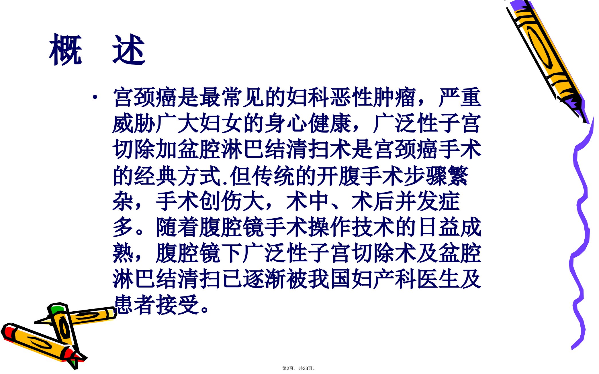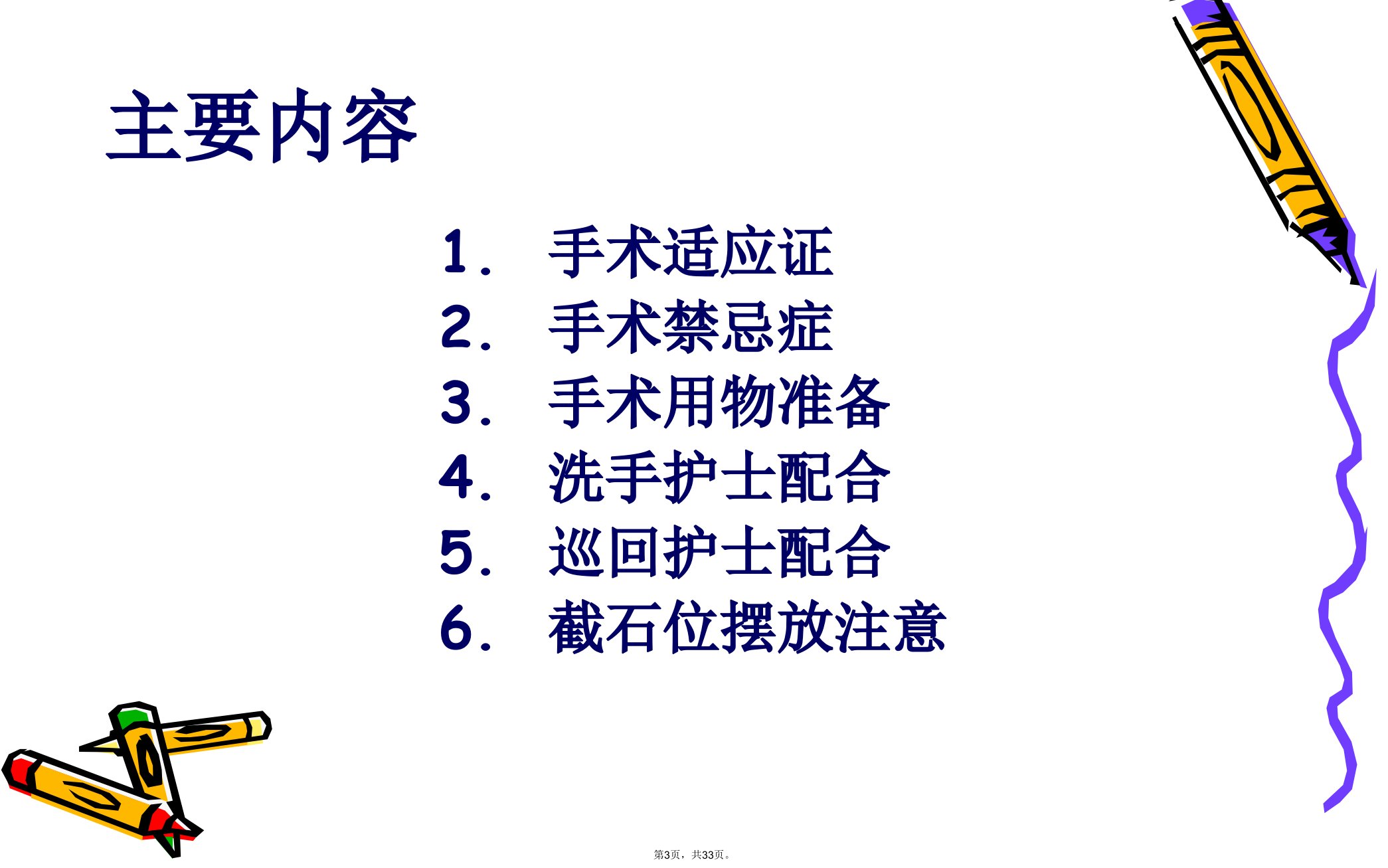 腹腔镜下宫颈癌根治术摘要宫颈癌作为最常见的妇科恶性肿瘤严重威胁女性健康。广泛性子宫切除加盆腔淋巴结清扫术是经典手术方式但传统开腹手术步骤繁杂、创伤大、并发症多。随着腹腔镜技术成熟腹腔镜下广泛性子宫切除术及盆腔淋巴结清扫术逐渐被接受。手术适应证包括子宫肌瘤、子宫内膜异位症、CINIII等;禁忌症有严重心血管疾病、呼吸系统疾病、出血性疾病等不能耐受麻醉者子宫过大、盆腔粘连严重者。用物需准备腹腔镜摄像系统、电刀、超声刀等设备以及开腹包、腹腔镜器械包等物品。手术时洗手护士需提前准备协助医生消毒铺巾连接设备并检测性能;巡回护士则负责建立静脉留置针、摆放截石位、放置显示器等。术中需注意无菌操作避免交叉污染并保养好贵重仪器。巡回护士要密切观察病情防止高碳酸血症等并发症手术结束检查患者皮肤防止压疮。截石位摆放时需垫软垫、控制高度和角度避免压迫防止血栓形成和神经损伤。