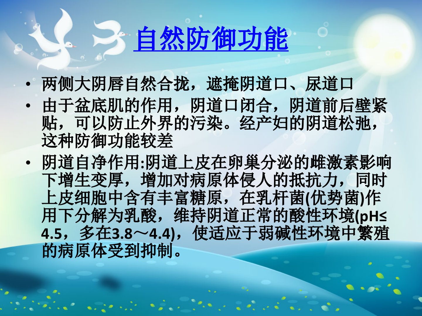 女性生殖道具有自然防御功能如大阴唇合拢、阴道口闭合及阴道自净作用可防止外界污染。但经产妇等人群防御功能较差易引发炎症。常见妇科炎症有:滴虫性阴道炎由阴道毛滴虫引起月经前后易发作表现为稀薄泡沫状白带增多、外阴瘙痒;外阴阴道假丝酵母菌病由白色念珠菌感染所致好发于孕妇、糖尿病患者等表现为外阴瘙痒、白色稠厚白带;细菌性阴道病因阴道内乳酸杆菌减少而其他细菌繁殖引起表现为阴道分泌物增多、有异味。宫颈炎病理分类包括宫颈糜烂、宫颈息肉等宫颈糜烂根据糜烂深浅和面积大小分型表现为阴道分泌物增多。治疗包括物理治疗、药物治疗和手术。预防妇科炎症需注意个人卫生、提倡淋浴、穿棉质内裤、积极治疗相关疾病、加强锻炼、保持乐观情绪、减少人流次数、积极治疗并定期检查宫颈。