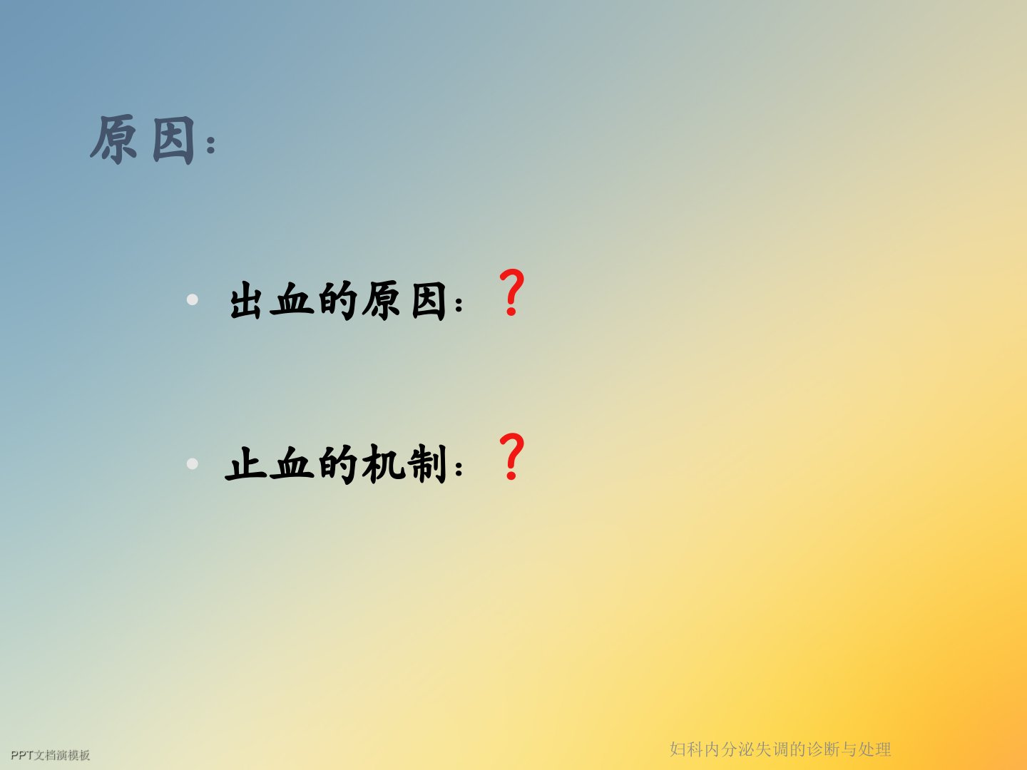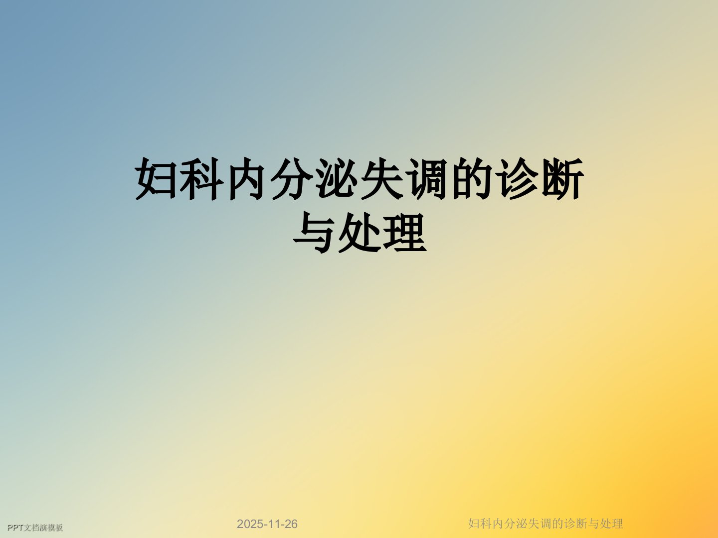妇科内分泌失调的诊断与处理妇科内分泌失调的诊断与处理治疗误区:功血:——诊刮闭经:——黄体酮妇科内分泌失调的诊断与处理原因:出血的原因:?止血的机制:?妇科内分泌失调的诊断与处理大脑皮质下丘脑-垂体-卵巢轴hypothalamic-pituitary-ovarianaxisHPOA卵巢(ovarinan)子宫(uterus)排卵(ovulate)月经(menstruation)妇科内分泌失调的诊断与处理妇科内分泌失调的诊断与处理正常月经周期中的子宫内膜:月经期:第1-5天,雌、孕激素同时降到最低,子宫内膜坏死、剥脱,撤退性出血。(内膜妇科内分泌失调的诊断与处理通过辅助检查了解:——排卵...