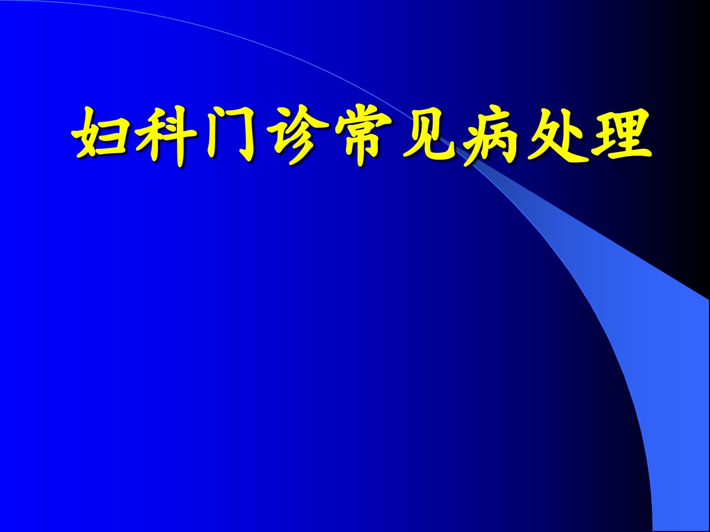 欢迎专家莅临指导妇科门诊常见病处理要点掌握妇科常见病的诊断及临床处理。常见妇科疾病包括:1生殖器炎症:阴道炎(滴虫性、霉菌性、细菌性、老年性)各有特定症状和治疗方法如滴虫性阴道炎用甲硝唑治疗性伴侣同治;霉菌性阴道炎以局部用药为主;细菌性阴道病以抗厌氧菌药为主;老年性阴道炎则抑菌并增加抵抗力。2生殖器肿瘤:子宫肌瘤、卵巢囊肿等。3其他:阴道出血、流产、急腹症(异位妊娠、卵巢囊肿蒂扭转)、生育方面问题(早孕诊断、不孕症)等。4慢性宫颈炎:以分泌物增多为主治疗以局部治疗为主包括物理治疗和中药验方。5盆腔炎:以输卵管炎及输卵管卵巢炎最常见分急慢性妇检可见宫颈举痛等治疗以抗生素为主。