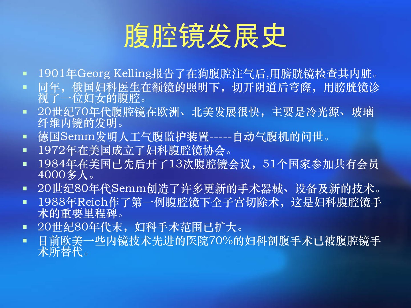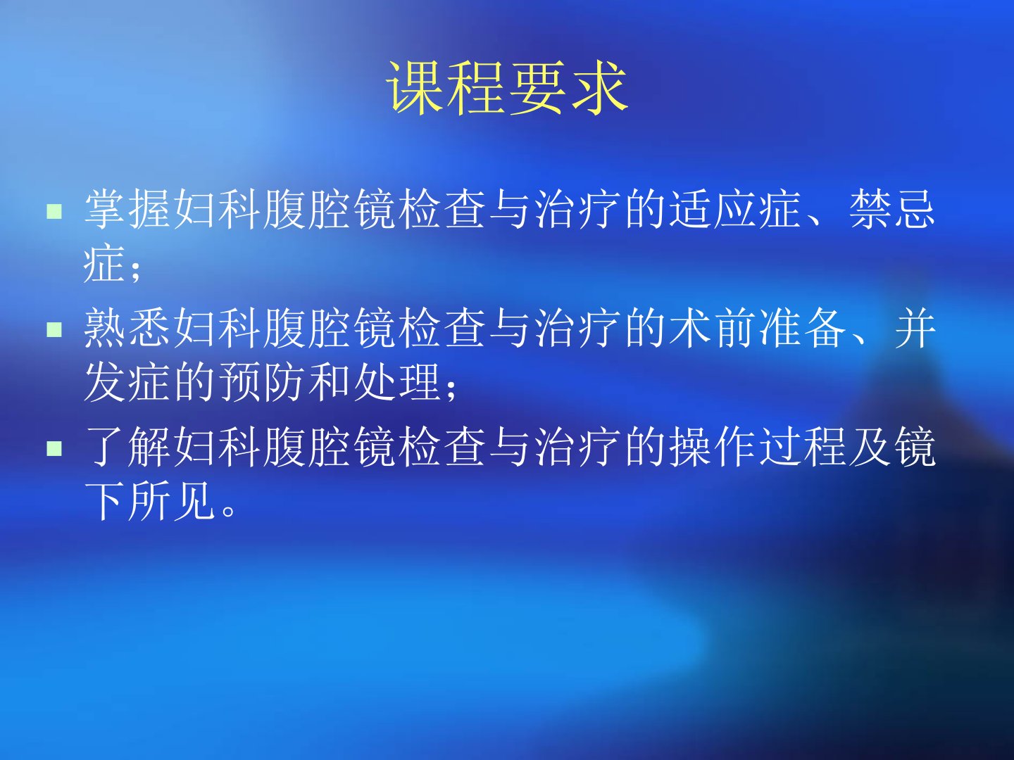 妇科腹腔镜课程要求掌握检查与治疗的适应症、禁忌症熟悉术前准备及并发症预防。腹腔镜发展史悠久1901年已有相关尝试20世纪70年代在欧洲、北美快速发展80年代手术范围扩大目前欧美部分医院70的妇科剖腹手术已被腹腔镜替代。国内20世纪60年代引进腹腔镜90年代后进入镜下手术阶段但多数医院仅达2级水平。腹腔镜手术有局限性应用范围较窄有一定中转开腹率并发症发生率也较高推广关键在于规范操作和设立医生培训制度。腹腔镜手术具有创伤小、痛苦小、恢复快、住院时间短、节省费用、切口疤痕不明显、并发症少等特点。设备和器械包括光源、传导系统、内窥镜、电手术器械等。术前需进行心理准备和多项检验术后需注意饮食、生命体征变化和伤口处理。适应症包括盆腔疼痛鉴别诊断、盆腔包块性质鉴别诊断等禁忌症包括严重心血管疾病、肺功能不全等。基本操作步骤包括体位调整、外生殖器和腹部准备、腹壁穿刺、腹腔探查、电凝电切等并发症包括血管损伤、胃肠道损伤、泌尿系统损伤等预防关键在于规范操作、掌握穿刺技术、保持尿管通畅等。