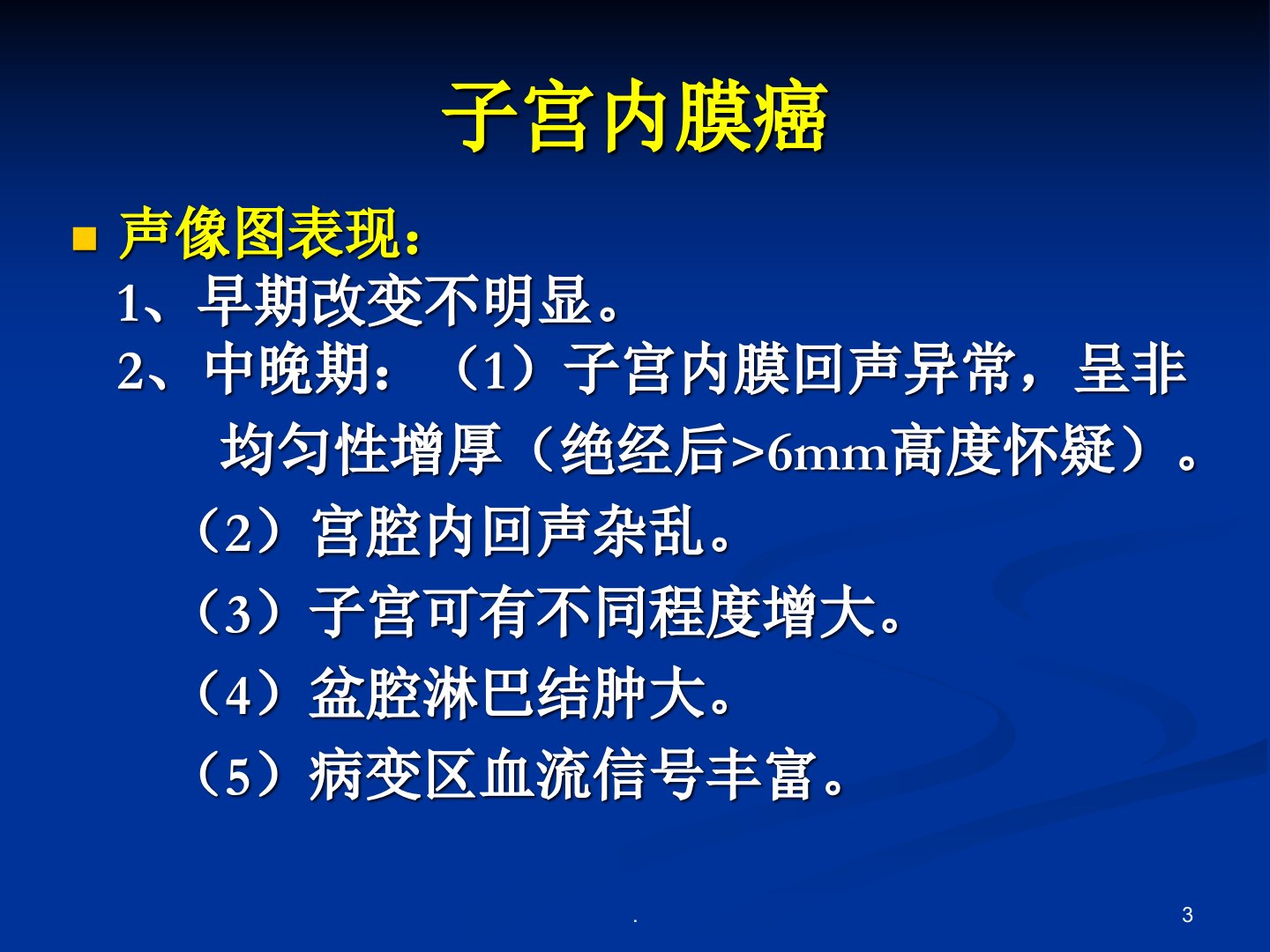 妇科超声检查.子宫内膜癌(子宫体癌)发生:占宫体恶性肿瘤的90%,多发生于50岁以上的绝经期妇女。临床表现:绝经期阴道不规则出血、血性分泌物、阵发性腹痛。.子宫内膜癌声像图表现:1、早期改变不明显。2、中晚期:(1)子宫内膜回声异常,呈非均匀性增厚(绝经后>6mm高度怀疑)。(2)宫腔内回声杂乱。(3)子宫可有不同程度增大。(4)盆腔淋巴结肿大。(5)病变区血流信号丰富。.子宫内膜癌.子宫腺肌病即子宫内膜异位到子宫肌层内,子宫多呈均匀性增大,后壁增厚较前壁显著。若内膜局限性生长形成结节称子宫腺肌瘤。临床表现:痛经、月经量增多、剧烈腹疼。.子宫腺肌病声像图表现:1、子宫均匀性增大,前后径增大明显...