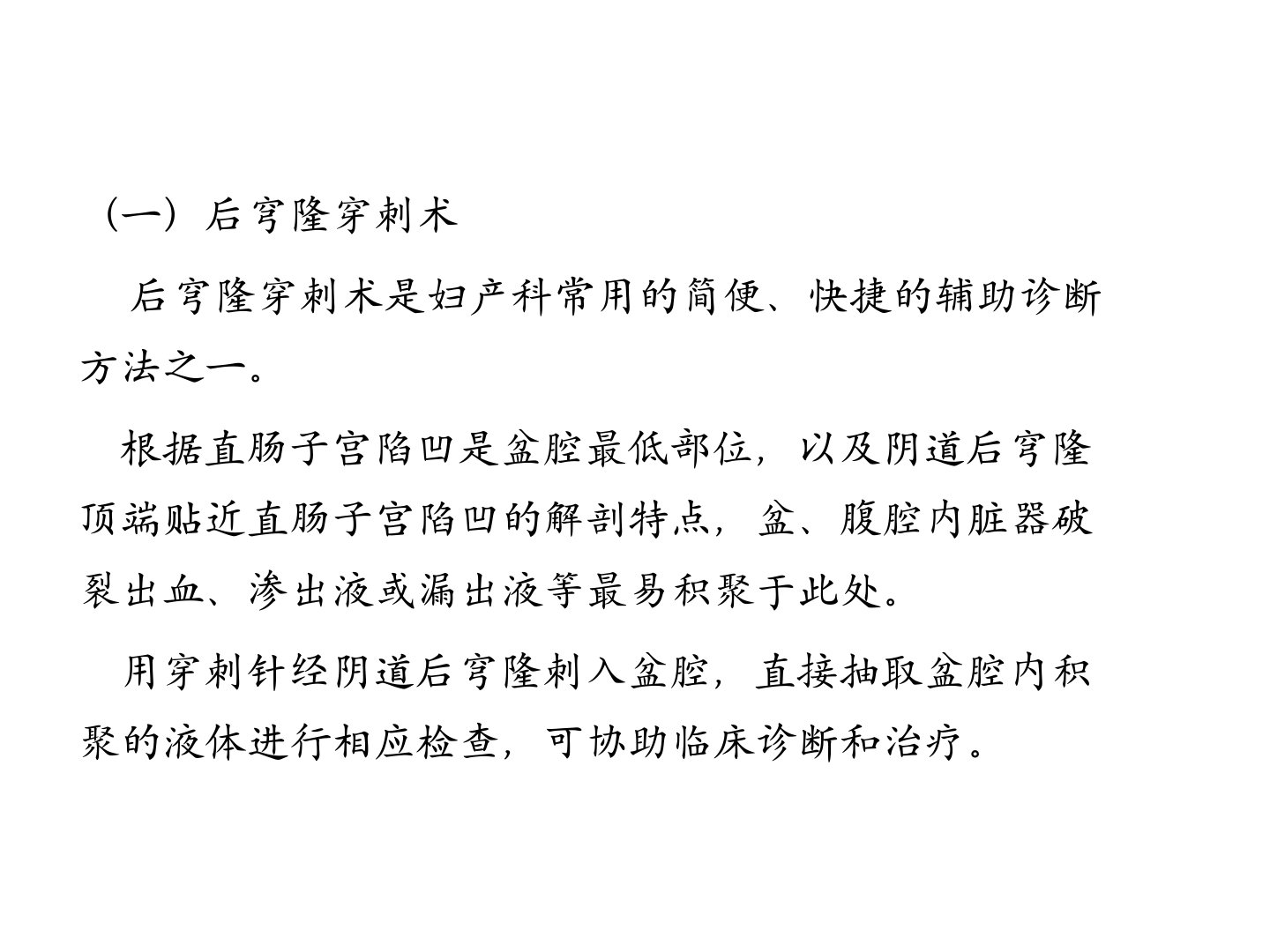 穿刺术1(一)后穹隆穿刺术后穹隆穿刺术是妇产科常用的简便、快捷的辅助诊断方法之一。根据直肠子宫陷凹是盆腔最低部位,以及阴道后穹隆顶端贴近直肠子宫陷凹的解剖特点,盆、腹腔内脏器破裂出血、渗出液或漏出液等最易积聚于此处。用穿刺针经阴道后穹隆刺入盆腔,直接抽取盆腔内积聚的液体进行相应检查,可协助临床诊断和治疗。【目的】怀疑有腹腔内出血时,如输卵管妊娠流产或破裂等1怀疑盆腔内有积液、积脓时,若为盆腔脓肿,可行穿刺引流及注入广谱抗生素治疗2B型超声引导下行卵巢子宫内膜异位囊肿或输卵管妊娠部位注药治疗3B型超声引导下经后穹隆穿刺取卵,用于各种助孕技术4【禁忌证】盆腔严重粘连,较大肿块占据直肠子宫陷凹部位并...