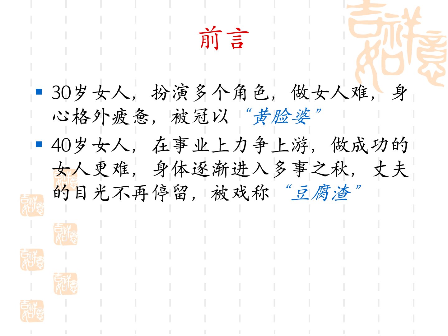 摘要30岁和40岁的女性常因多重角色而身心疲惫健康问题不容忽视。德国哲学家权本华认为健康是幸福的基础而我国癌症死亡率高其中肺癌、肝癌、胃癌、宫颈癌等被列为重点防治对象。妇科疾病中生殖道感染尤为常见包括滴虫性、念珠菌性阴道炎、细菌性阴道病等。滴虫性阴道炎治疗需足够疗程及性伴同治;念珠菌性阴道炎分单纯性和复杂性治疗各有侧重;细菌性阴道病发病率高处理原则是有症状的确诊者需治疗。CT、支原体感染存在诊断治疗问题宫颈炎分急慢性只有有明显症状者才需要治疗。盆腔炎性疾病诊治有指南治疗需清除病原体。防治外源性和内源性感染很重要。子宫肌瘤常见宫颈癌可预防和早期诊断高危型HPV感染是必备条件治疗宫颈病变可扼制癌变。宫颈癌筛查有最佳方案和注意事项HPV阳性不代表疾病CIN1原则上无需治疗CIN23必须治疗治疗后需长期随访。