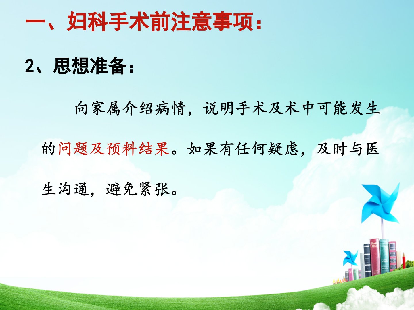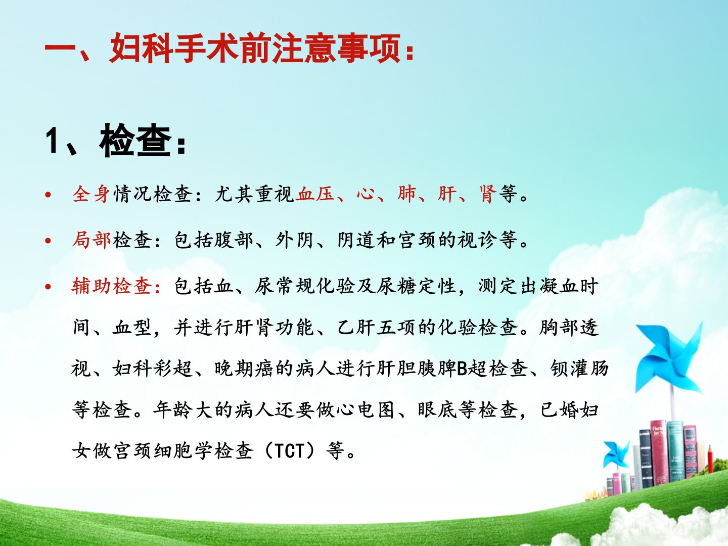妇科常见疾病的健康教育摘要妇科手术前患者需接受全身与局部检查及辅助检查如血压、心肺肝肾检查血尿常规等已婚妇女还需做宫颈细胞学检查。同时要做好思想准备与医生充分沟通;进行体质准备包括适应性锻炼、饮食管理(术前8小时禁食、6小时禁饮)、肠道与皮肤准备、阴道准备及导尿、配血等。术后6小时内禁饮食之后可进水、流食排气后遵医嘱进食半流食;6小时后开始活动开腹手术约23天下床腹腔镜手术24小时下床;注意观察术后不适及时沟通治疗;保持休息与卫生限制陪人探视。出院后不同手术患者有特定饮食、休息、活动及卫生要求如子宫切除术后禁性生活3个月;滋养细胞疾病严格避孕两年;化疗后注意个人卫生防止感染;宫外孕保守治疗定期复查等。计划生育方面介绍了避孕措施、终止妊娠方式及术后注意事项。