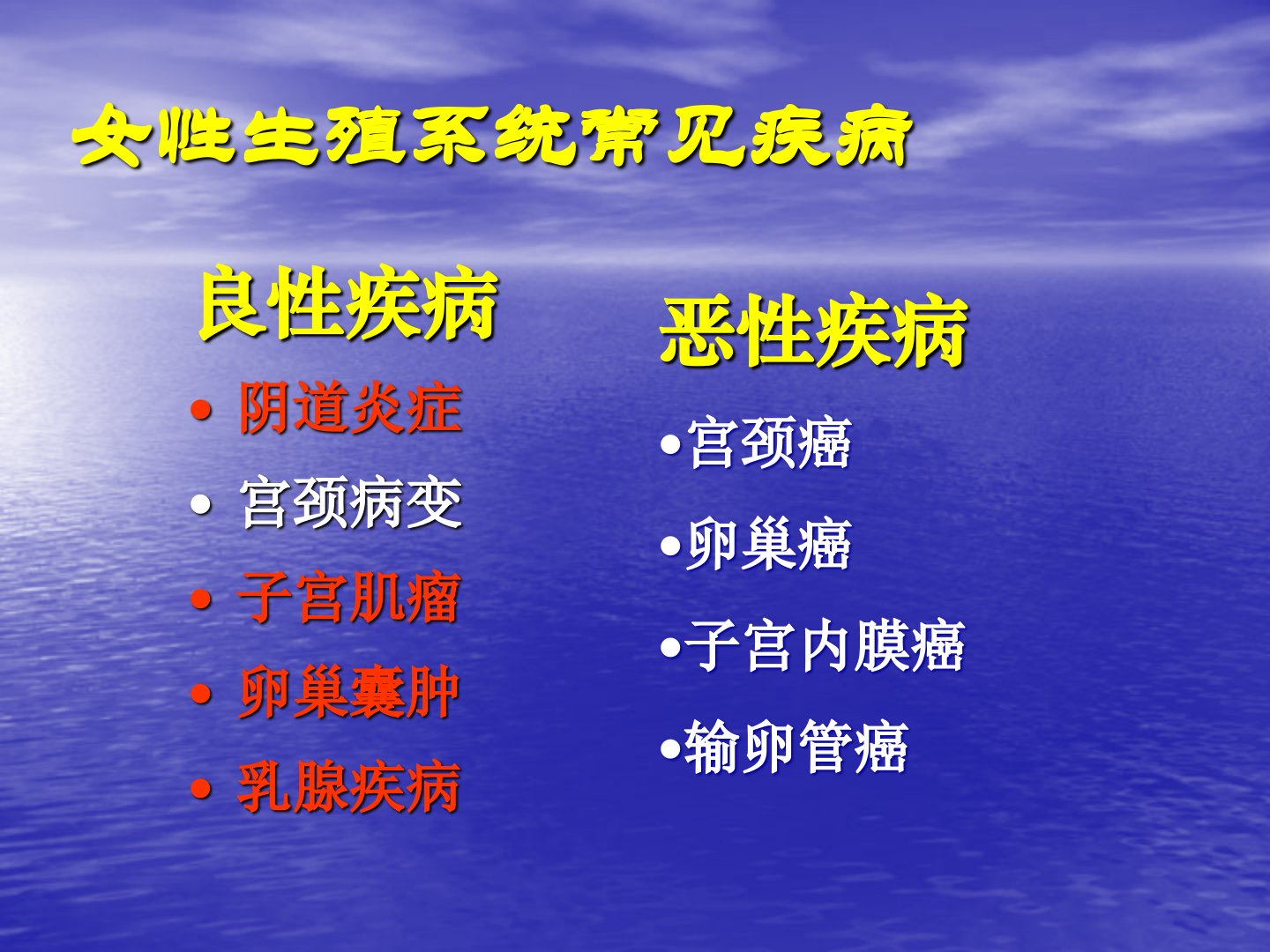 上海长宁区妇幼保健院王萍医生介绍了妇科常见疾病。良性疾病方面阴道炎症包括滴虫性、假丝酵母菌(霉菌性)、老年性及细菌性阴道病特点为白带增多、外阴瘙痒可发现病原体需男女双方同时治疗假丝酵母菌阴道炎易反复发作病原体以白色念珠菌为主诱因包括使用广谱抗菌素、接受长期雌激素药物治疗等治疗首选栓剂不推荐不明确的中成药不主张阴道冲洗;子宫肌瘤多发生在3050岁妇女症状包括月经改变、腹块等治疗需根据患者情况全面考虑可随访观察或手术治疗;卵巢囊肿分为生理性和病理性生理性一般小于5cm会自然消失病理性不会且呈增大趋势发现方法主要是B超处理上生理性不需处理病理性需手术切除方式有传统和微创手术。恶性疾病包括宫颈癌、卵巢癌、子宫内膜癌、输卵管癌。此外还介绍了乳腺常见疾病的检查和防治。