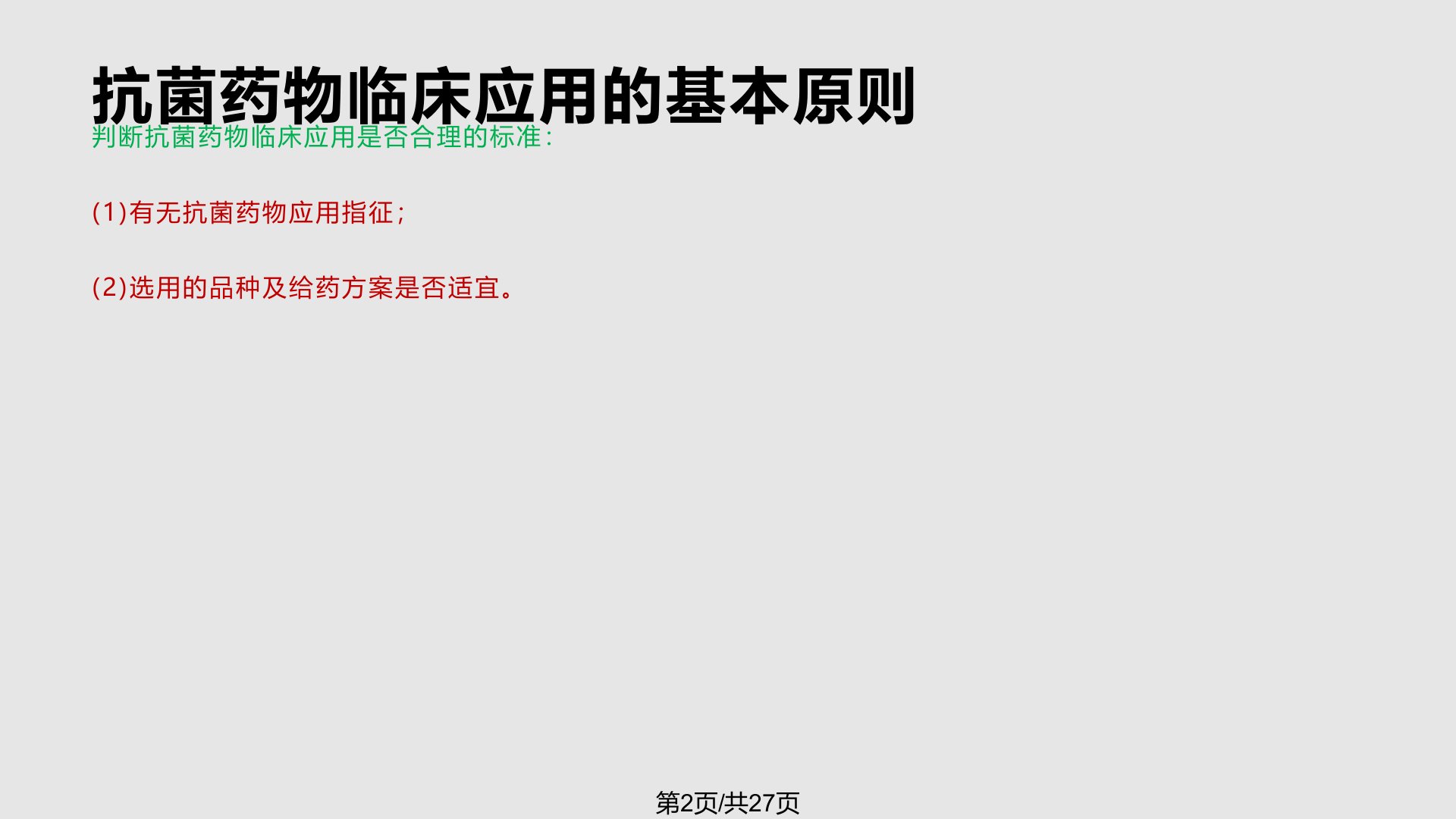 主要内容一、抗菌药物治疗性应用的基本原则二、妇科手术抗菌药物预防性应用的基本原则三、妇科常见感染抗菌药物选择四、妇科常用抗菌药物特点及用法第1页/共27页抗菌药物临床应用的基本原则判断抗菌药物临床应用是否合理的标准:(1)有无抗菌药物应用指征;(2)选用的品种及给药方案是否适宜。第2页/共27页一、抗菌药物治疗性应用的基本原则(一)、诊断为细菌性感染者方有指征应用抗菌药物根据患者的症状、体征、实验室检查或放射、超声等影像学结果,诊断为细菌、真菌感染者方有指征应用抗菌药物;由结核分枝杆菌、非结核分枝杆菌、支原体、衣原体、螺旋体、立克次体及部分原虫等病原微生物所致的感染亦有指征应用抗菌药物。缺乏细...