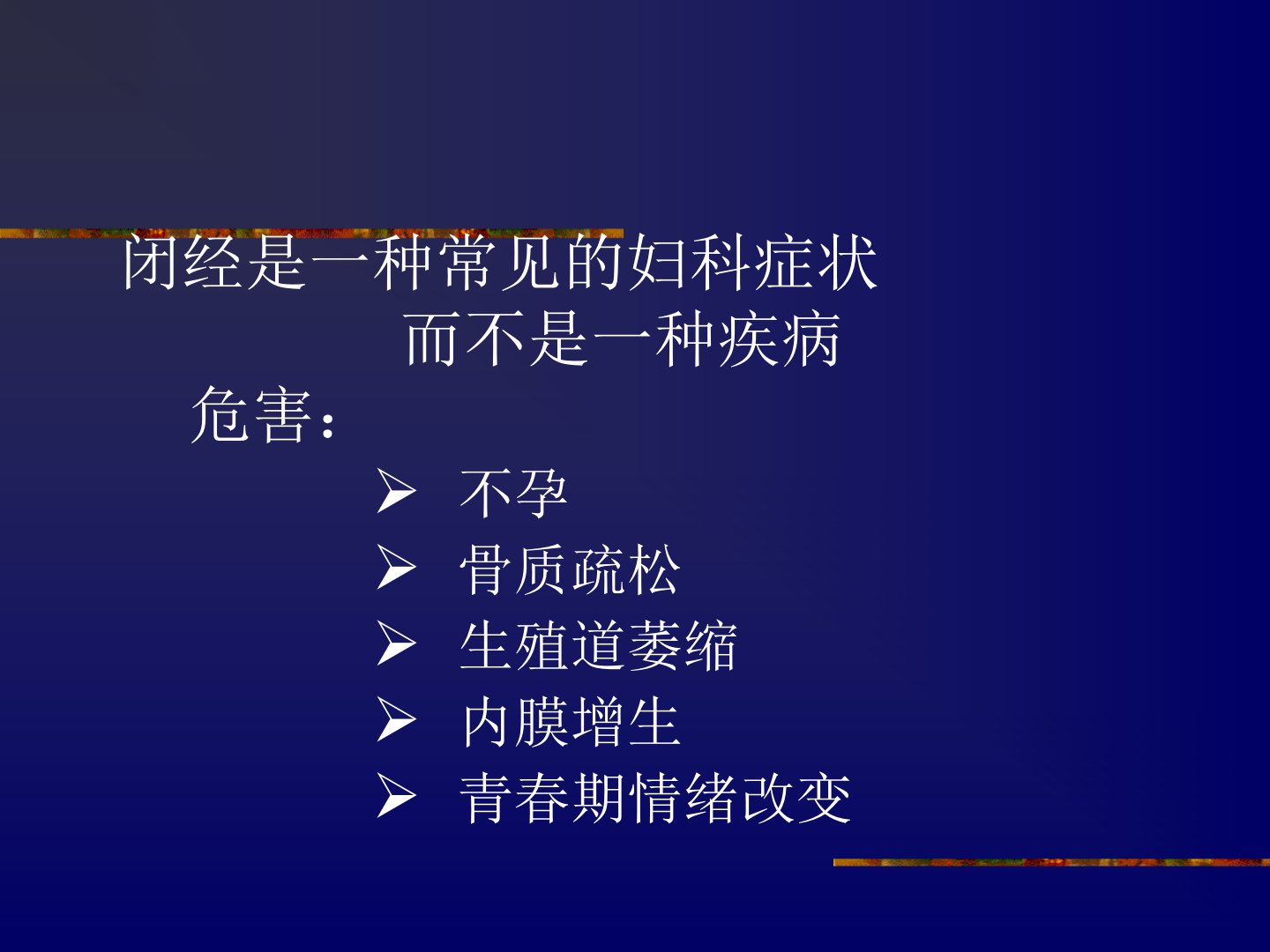 闭经是常见妇科症状,危害包括不孕、骨质疏松等。定义上,分为原发性闭经(16岁第二性征已发育或14岁第二性征未发育仍无月经来潮者)和继发性闭经,后者又包括生理性(如青春期、妊娠期等)和病理性闭经。原发性闭经多由先天性疾病或畸形引起,如先天性无子宫、雄激素不敏感综合征等。继发性闭经病因多样,包括下丘脑性(如精神应激、神经性厌食)、垂体性(如垂体梗死、垂体肿瘤)、卵巢性(如卵巢功能早衰)和子宫性闭经(如Asherman综合征)。诊断时,首先查找原因,确定是哪种疾病引起,需详细询问月经史、家族史等,并进行全身体格检查和盆腔检查。辅助检查包括功能试验、激素测定、子宫和卵巢功能检查等。治疗包括体质性治疗、心理治疗、病因治疗、内分泌药物治疗(如激素替代治疗、诱发排卵)和手术治疗。