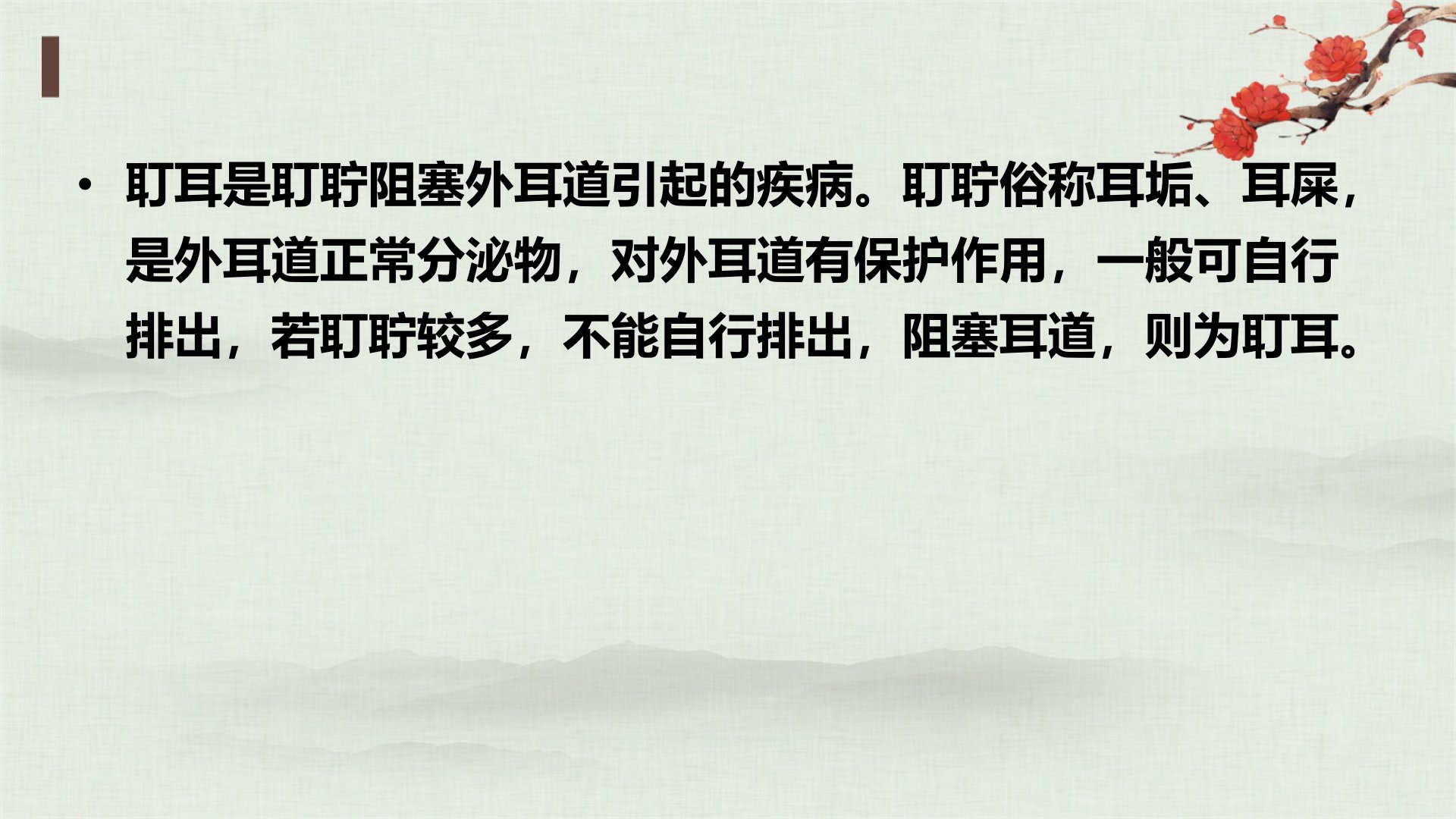 耵耳与耳异物为耳部常见疾病。耵耳是耵聍阻塞外耳道所致一般可自行排出若阻塞耳道则致病。症状包括耳堵塞感、胀、痛、耳鸣、听力下降等检查可见耵聍堵塞外耳道治疗以外治法为主可活动且未完全阻塞的耵聍可用膝状镊或耵聍钩取出坚硬者需先软化后清除预防上一般耵聍可自行排除较多堵塞耳道者需到医院处理预后良好但可反复发生。耳异物是外来物体误入耳窍多见于儿童成人亦可发生。症状因异物形态、性质和部位而异治疗以外治为主根据异物情况选择适当方法取出预防上异物入耳后应由专科医生取出戒除挖耳习惯教育小孩不将细小物体放入耳内野外露宿加强防护预后良好较大异物或昆虫损伤鼓膜则影响听力。