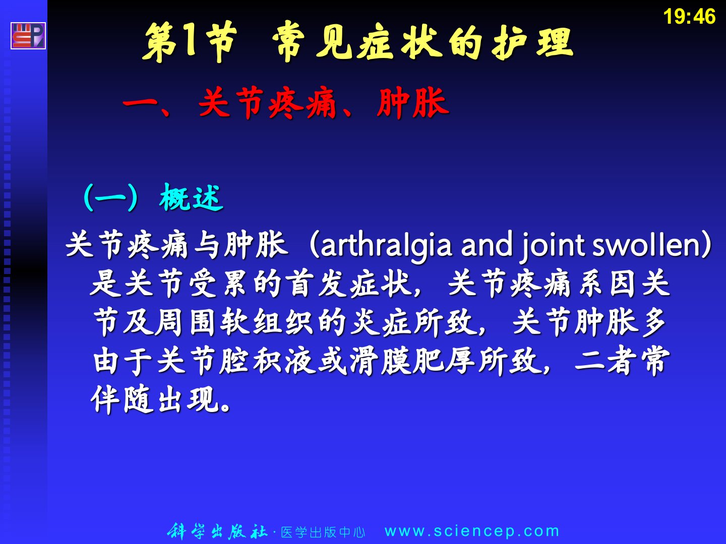 内科护理学夏泉源刘士生主编全国高职高专医药院校课程改革规划教材供护理、涉外护理、助产等专业使用第8章风湿性疾病患者的护理风湿性疾病(rheumaticdiseases)是指累及骨、关节及其周围软组织的一组疾病。病因有免疫、感染、代谢、内分泌、环境、遗传、肿瘤等。弥漫性结缔组织病是风湿病最重要的组成部分,具有以下特点:①属自身免疫病。②以血管和结缔组织慢性炎症的病理改变为基础。③常累及多个系统,包括肌肉、骨骼系统。④同一疾病,不同病人的临床表现和预后差异甚大。⑤糖皮质激素治疗有一定反应。⑥慢性病程中逐渐累及多个器官和系统,早期诊断、合理治疗,才能获得到良好预后。第1节常见症状的护理一、关节疼痛、...