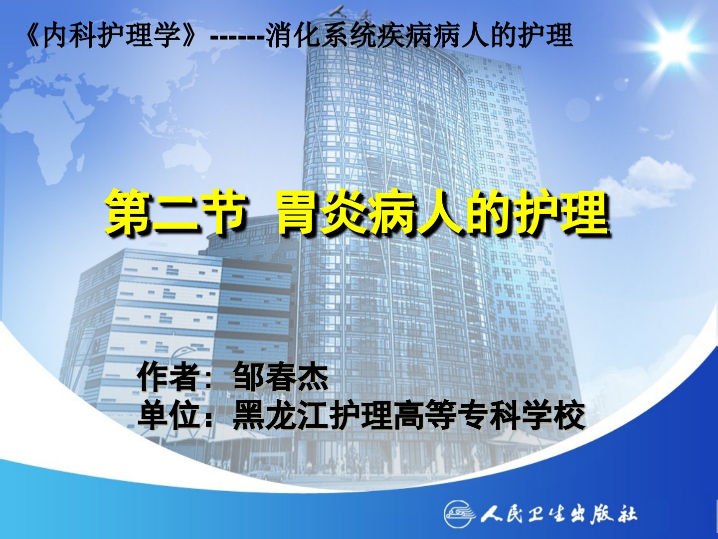 《内科护理学》作者邹春杰概述了胃炎病人的护理要点。胃炎是最常见的消化道疾病之一分为急性和慢性两类发病率随年龄增长而增高。急性胃炎由多种病因引起如药物(NSAIDs、乙醇等)、急性应激、感染等临床表现为上腹部症状严重者可致上消化道出血。护理需评估健康史、身体状况、心理社会状况及辅助检查治疗原则为针对病因防治药物引起者立即停药并服用抑制胃酸、保护胃黏膜药物大出血时采取抢救措施。慢性胃炎主要由Hp感染、不良饮食习惯、自身免疫等引起表现为非特异性消化不良少数可发展为胃癌。护理评估包括健康史、身体状况等治疗原则为消除病因、缓解症状等。护理措施包括休息与活动、饮食调整、病情观察、用药护理、心理护理及健康指导。护理目标为病人疼痛减轻、养成规律饮食习惯、保持良好营养状态。小结指出慢性胃炎临床表现不突出需胃镜确诊饮食要求和习惯对胃炎病人非常重要。