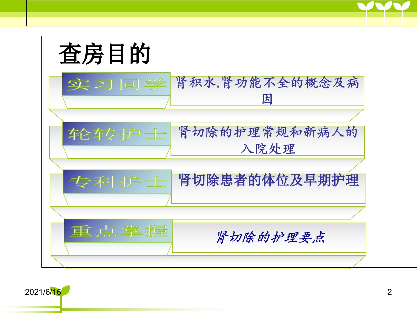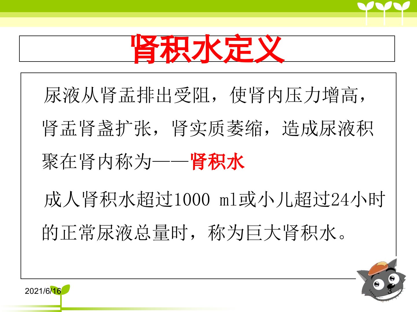 左肾切除护理查房摘要本次查房主题为左肾切除护理由彭志梅主持。肾积水指尿液排出受阻、肾内压力增高导致的尿液积聚成人超过1000ml或小儿超过24小时正常尿液总量即为巨大肾积水泌尿系统及其邻近病变都可能造成肾积水。肾功能不全则是一种急性病理过程临床表现为少尿、氮质血症等症状。辅助检查包括实验室检查(尿液、血液检查)和影像学检查(B超、CT、MRI等)但肾功能不全患者使用造影剂可能加重损害。患者郝五妮45岁因左腰部隐痛不适入院B超显示左肾重度积水后行左肾切除术术后给予补液抗感染等治疗病情平稳。护理诊断包括疼痛、出血、引流效能降低、体液失衡、营养失调、感染危险、预感性悲哀、活动无耐力、皮肤受损危险、知识缺乏等。护理措施涵盖体位调整、生命体征监测、饮食护理、心理支持、活动指导、皮肤护理及健康指导等多个方面旨在促进患者康复预防并发症。