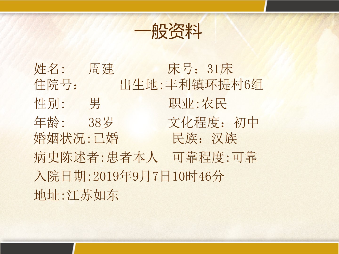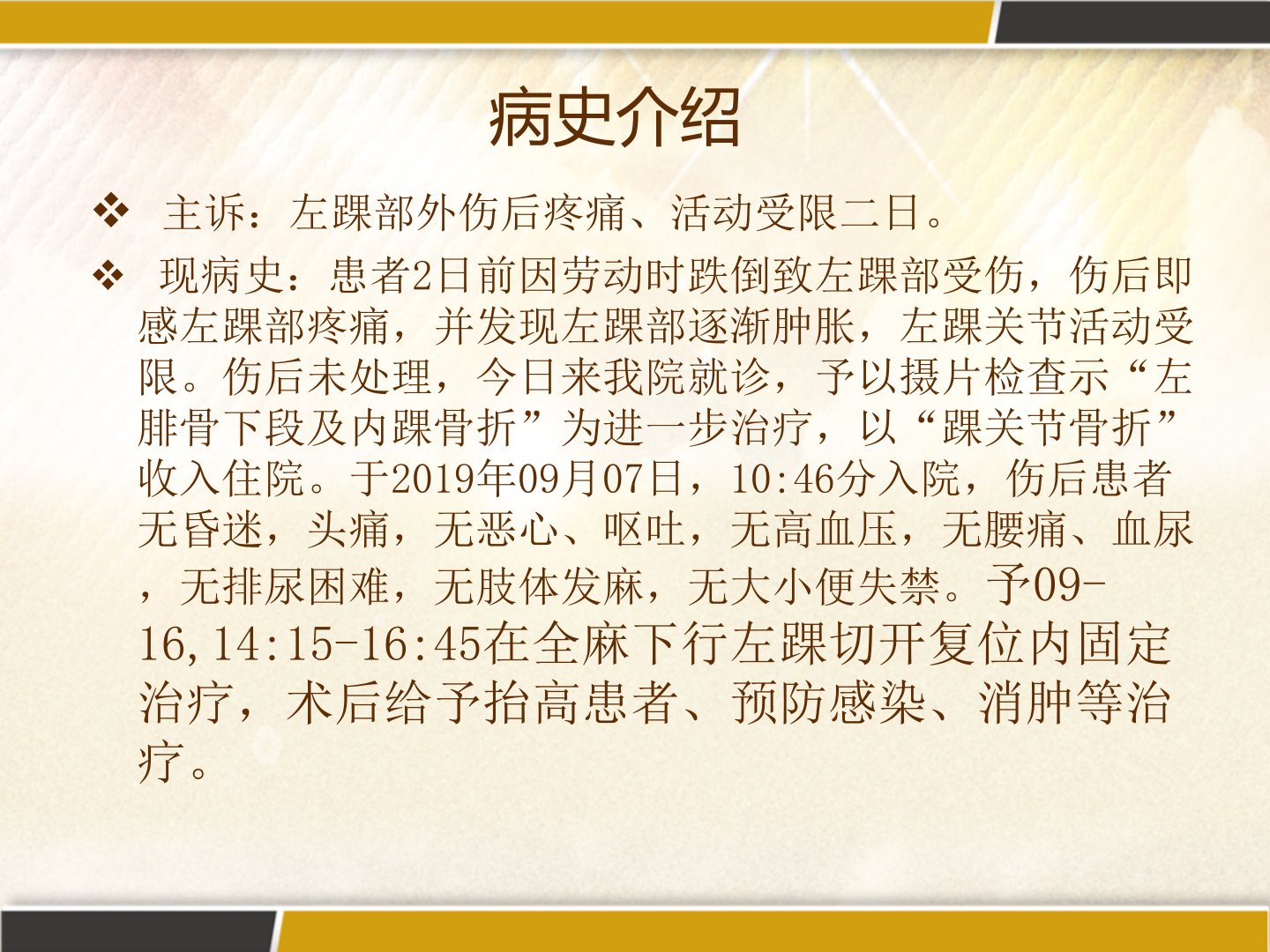 患者周建38岁男性农民因劳动跌倒致左踝部受伤出现疼痛、肿胀及活动受限摄片检查示“左腓骨下段及内踝骨折”于2019年9月7日入院。既往体健无不良嗜好个人史、婚育史、家族史均无特殊。专科护理查体显示左踝部外观畸形、肿胀、压痛可扪及骨折断端活动障碍。护理问题包括:疼痛与骨折、神经及软组织损伤有关采取制动抬高、药物止痛等措施后缓解;躯体活动障碍协助病人洗漱、指导功能锻炼后生活部分自理;有皮肤受损危险预防压疮、保持皮肤清洁未发生皮肤损伤;焦虑心理护理后焦虑感消失;知识缺乏指导功能锻炼后患者及家属掌握方法。潜在并发症包括关节僵硬、感染等需密切观察、妥善安置。健康教育包括功能锻炼、饮食调整、多晒太阳及保持心情舒畅等。