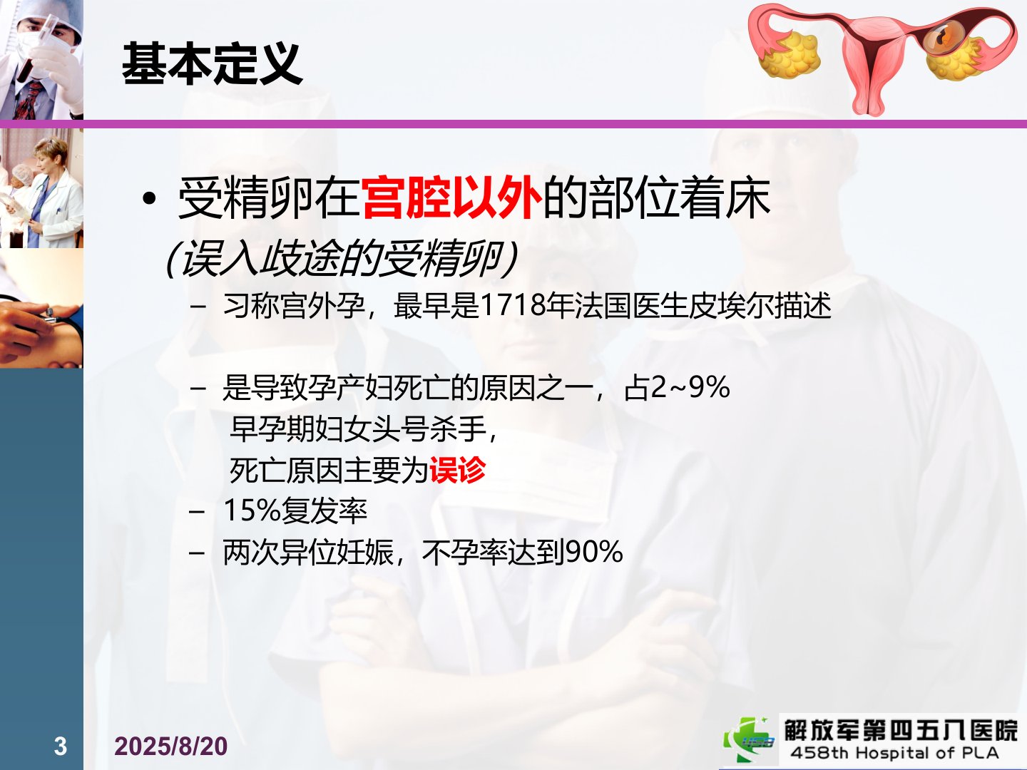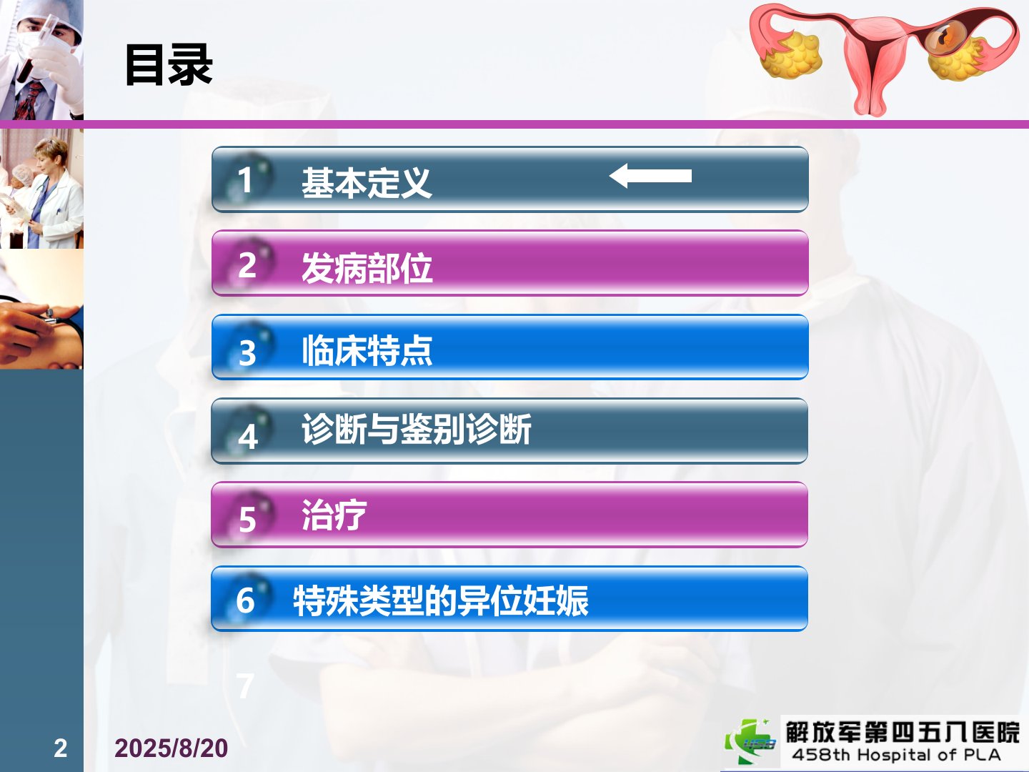 异位妊娠(EP)即受精卵在宫腔以外部位着床习称宫外孕是导致孕产妇死亡的原因之一占早孕期妇女死亡原因的29复发率为15两次异位妊娠后不孕率达90。其发病部位最常见为输卵管占所有妊娠的2且发病率有上升趋势病因包括盆腔炎性疾病、沙眼衣原体感染、宫内节育器使用等。输卵管妊娠有破裂、未破裂型和流产三种类型多数患者停经68周下腹痛为主可伴有阴道流血。诊断方法包括实验室检查(如尿hCG、血hCG、孕酮)、超声检查、阴道后穹窿穿刺及腹腔镜检查。异位妊娠需与卵巢黄体破裂、出血性输卵管炎、绒癌、卵巢囊肿蒂扭转、宫内孕不全流产等妇产科疾病及急性胃肠炎、急性阑尾炎等内科外科急腹症鉴别。治疗可选期待治疗、药物治疗或手术治疗具体方式需根据患者病情及生育需求决定。特殊类型异位妊娠包括宫颈妊娠、腹腔妊娠、宫角妊娠等需采取不同治疗策略。