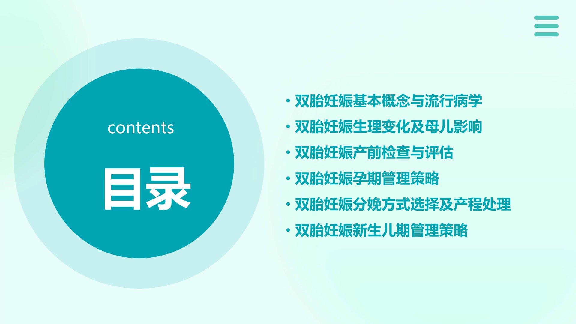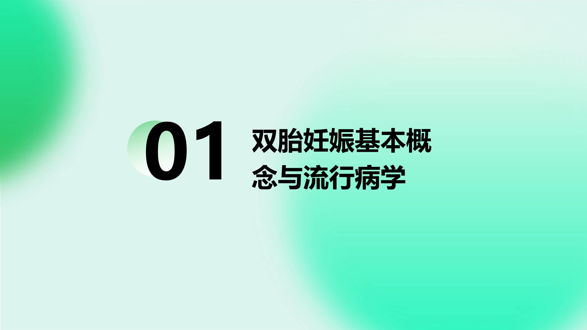 双胎妊娠PPT课件摘要:双胎妊娠指一次妊娠同时有两个胎儿形成根据受精卵性质可分为单卵双胎和双卵双胎发生率约占所有妊娠的112有家族史者几率增加。孕妇可能出现早孕反应重、子宫增大迅速、胎动频繁等症状B超可确诊并确定绒毛膜性和羊膜性。双胎妊娠孕妇并发症包括妊娠期高血压疾病、贫血、羊水过多等胎儿并发症有早产、胎儿生长受限、双胎输血综合征等。双胎妊娠子宫增大快循环、消化系统负荷加重胎儿生长受限、发育异常及早产风险增加胎盘、羊水、脐带异常发生率也高。产前检查包括孕早期确认双胎、评估孕妇基础健康状况孕中期详细评估胎儿生长发育孕晚期加强胎儿监护B超、宫高腹围测量、胎心监护等是常用手段。孕期管理需增加热量、蛋白质、矿物质及维生素摄入适当锻炼避免剧烈运动定期产检识别并干预高危因素。分娩方式选择需考虑产程进展、胎儿监护及产妇支持剖宫产有明确指征和手术技巧要求。新生儿期需全面评估生长状况制定个性化喂养计划定期监测生长发育对早产儿给予保暖、呼吸支持预防感染提供营养支持并指导家长掌握新生儿护理技能。