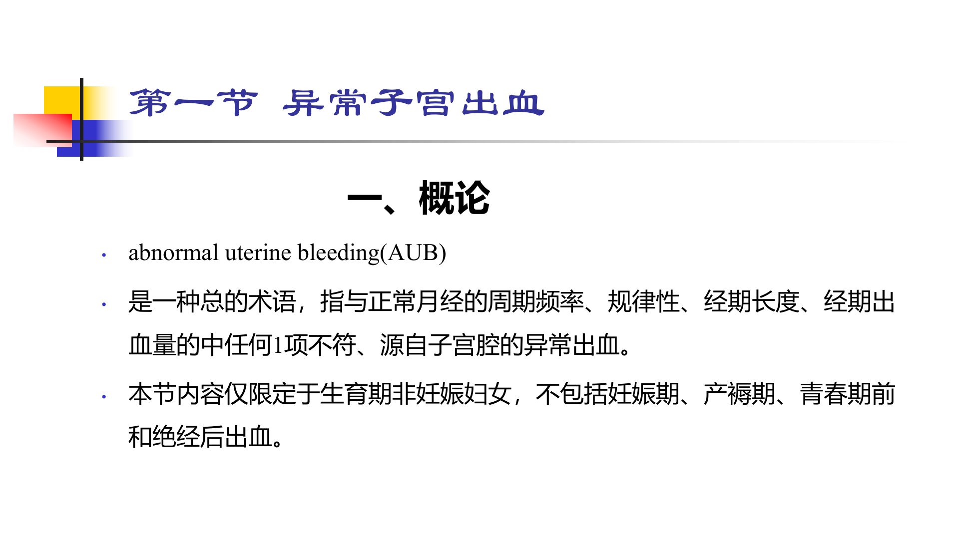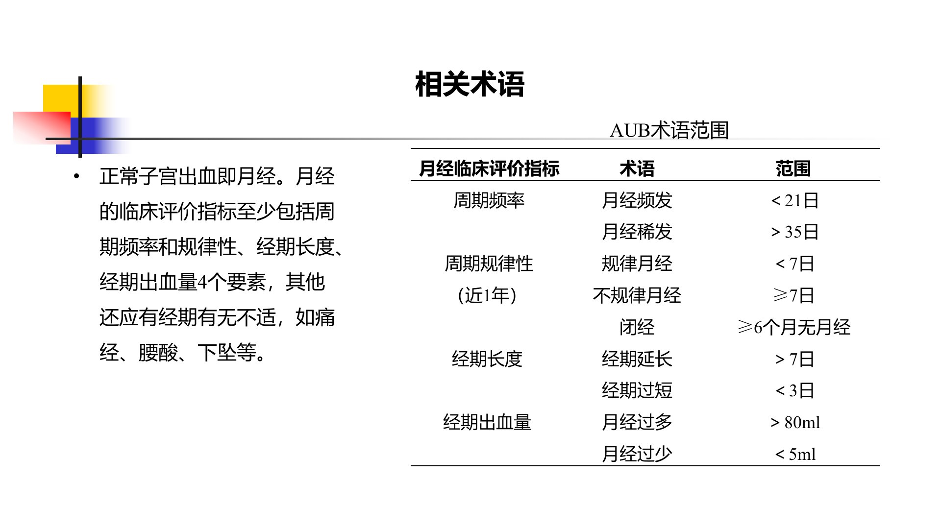 医学摘要:女性生殖内分泌疾病——异常子宫出血与闭经异常子宫出血(AUB):AUB指与正常月经不符的子宫腔异常出血限定于生育期非妊娠妇女。病因及分类采用PALMCOEIN系统分为结构性(PALM)与非结构性(COEIN)两大类9个类型。无排卵性AUB多因下丘脑垂体卵巢轴功能失调常见于青春期、绝经过渡期病理改变包括增殖期子宫内膜、子宫内膜增生(不伴与伴有不典型增生)、萎缩型子宫内膜。治疗原则为止血、调整周期根据年龄、生育要求选择药物或手术治疗。闭经:闭经分原发性与继发性。原发性闭经指年龄超16岁无月经或超14岁无第二性征发育;继发性闭经为正常月经后停止6个月或3个周期以上。病因复杂原发性闭经常因遗传或发育缺陷继发性闭经多与HPO轴调节异常有关。诊断需详细询问病史、体格检查及辅助检查。治疗原则为病因治疗、激素替代或针对病理生理紊乱的内分泌治疗必要时手术治疗。