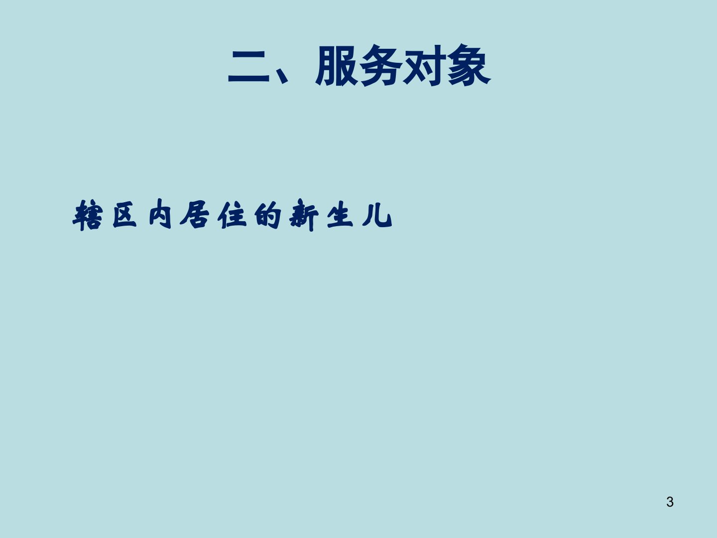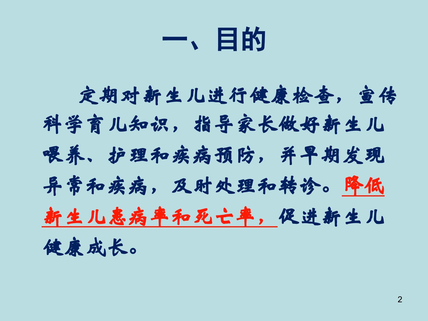 新生儿家庭访视及健康管理一、目的定期对新生儿进行健康检查,宣传科学育儿知识,指导家长做好新生儿喂养、护理和疾病预防,并早期发现异常和疾病,及时处理和转诊。降低新生儿患病率和死亡率,促进新生儿健康成长。二、服务对象辖区内居住的新生儿三、内容与方法(一)访视次数正常足月新生儿访视次数不少于2次。首次访视:在出院后7日之内进行家庭访视。如发现问题应酌情增加访视次数,必要时转诊。三、内容与方法(一)访视次数高危新生儿根据具体情况酌情增加访视次数首次访视应在得到高危新生儿出院(或家庭分娩)报告后3日内进行。发生高危新生儿危险因素孕周小于37周或大于42周者出生体重小于2500克或大于4000克者。出生体...