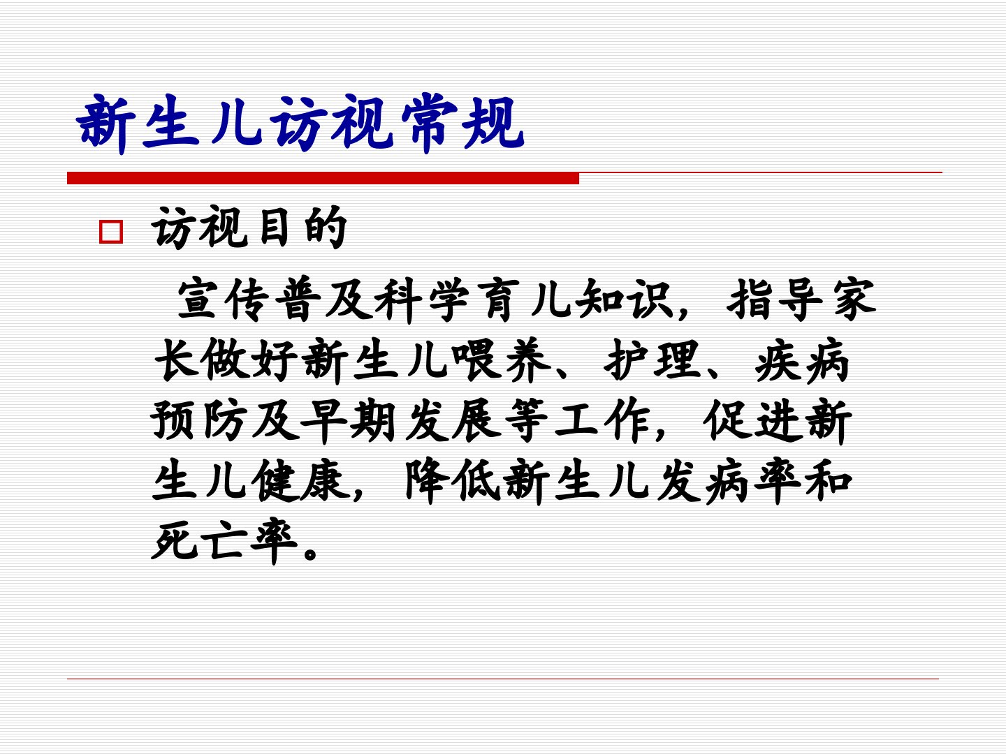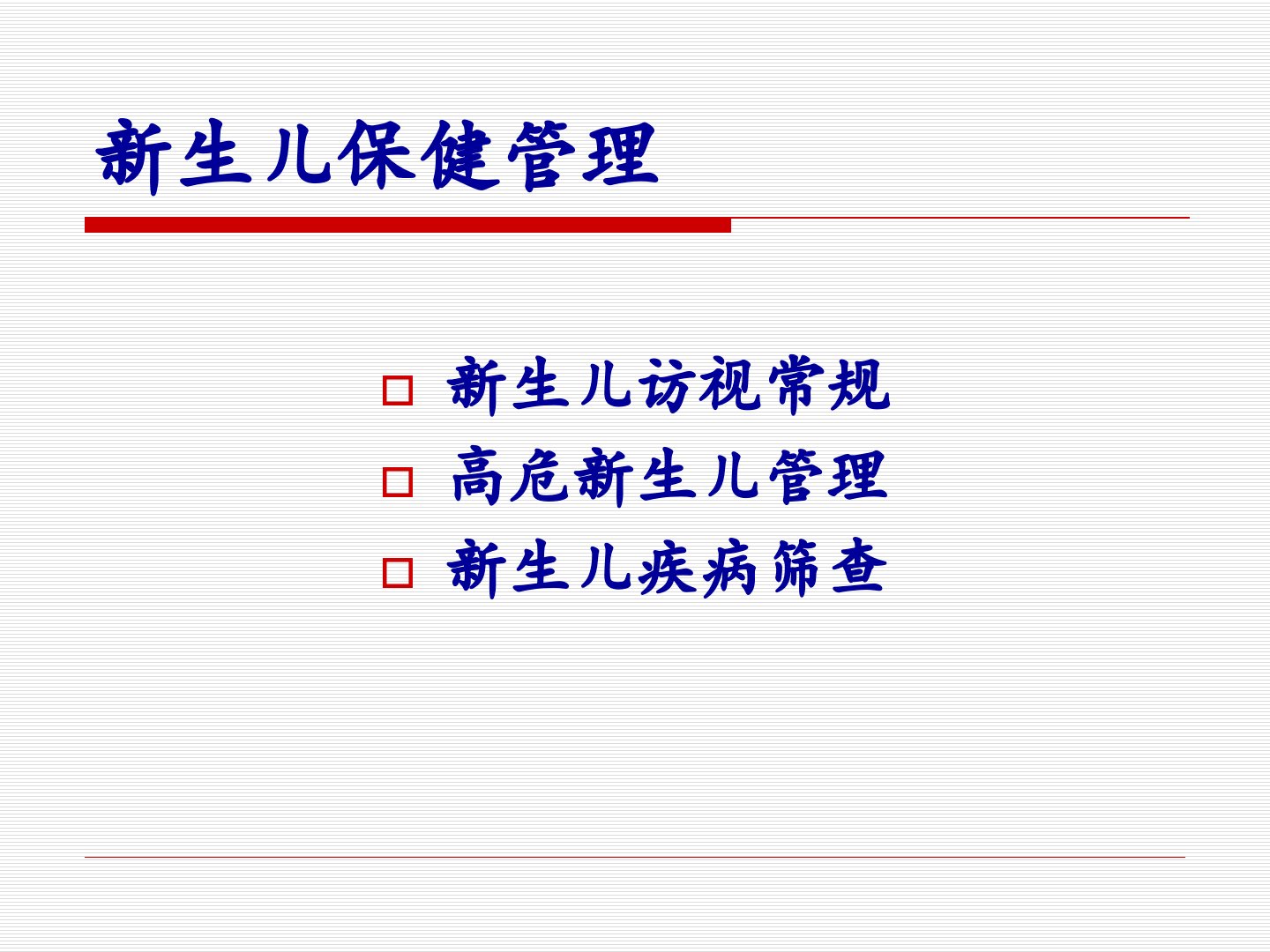 新生儿保健管理摘要新生儿保健管理涵盖新生儿访视、高危新生儿管理及新生儿疾病筛查。新生儿访视常规旨在普及科学育儿知识降低新生儿发病率和死亡率。访视时间为出生后3、7、14、28天异常则增加次数。访视内容依时间而异37天了解出生情况等14天看脐带脱落、黄疸消退28天测体重。访视包配备多种物品访视程序包括“一问二看三检查四指导五记录”。交流时需用温和语气、当地语言母亲害羞时先聊家常。观察指导涉及喂养、哭声、精神状态、穿盖、脐带、体温、呼吸次数、体重增长等局部感染及时处理。袋鼠式保暖方法简单经济增进母婴感情实施时需注意操作方法和监测婴儿情况。高危新生儿管理对有高危因素的新生儿重点管理明确管理对象注明“高危”字样根据情况决定访视次数注重体温、喂养、营养等指导指导家长观察新生儿情况异常及时转送恢复正常则转入健康儿童管理。新生儿疾病筛查主要针对苯丙酮尿症、先天性甲状腺功能低下症及新生儿听力。