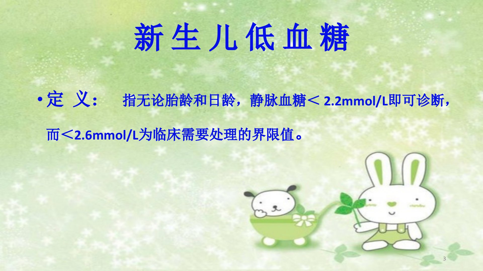 新生儿低血糖指无论胎龄和日龄静脉血糖22mmolL即可诊断26mmolL为临床处理界限值。病因包括:1糖原和脂肪贮存不足多见于低出生体重儿;2耗糖过多如新生儿患严重疾病;3高胰岛素血症如糖尿病母亲婴儿;4内分泌和代谢性疾病如垂体功能低下;5遗传代谢及其他疾病如半乳糖血症等。临床表现多样包括反应差、嗜睡、呼吸异常、心动过速等多为暂时性反复发作需考虑相关疾病。治疗上血糖22mmolL均需治疗无症状者可口服或静脉注射葡萄糖症状低血糖者需缓慢静脉注射葡萄糖持续或反复严重低血糖可加用激素。护理上需补充能量、注意保暖、早期多次足量喂养、密切观察病情变化。低血糖对新生儿危害大可能导致永久性脑损伤。血糖监测需固定血糖仪、选择采血部位。预防关键在于早期监测血糖、尽早喂养、控制葡萄糖输液速度和量、注意保暖和感染控制。