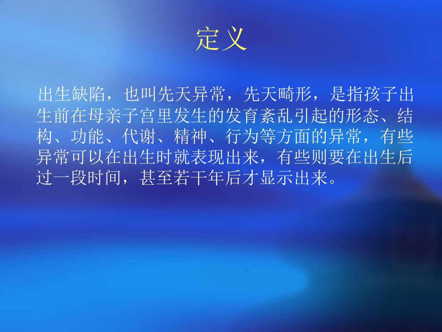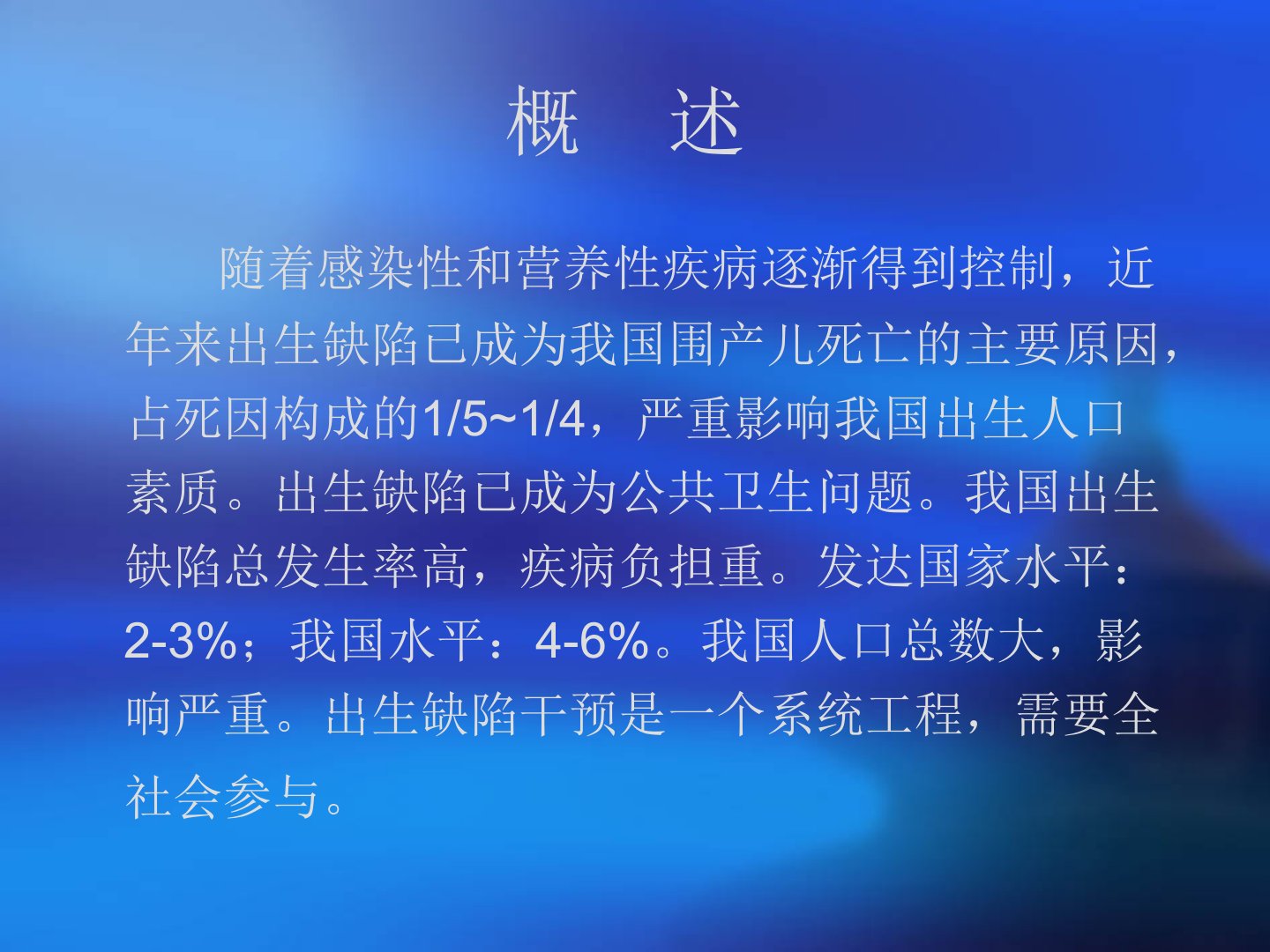 近年来出生缺陷已成为我国围产儿死亡主因占总死因构成的1514严重影响出生人口素质其总发生率高于发达国家干预需全社会参与。出生缺陷即先天异常指出生前在母体内发生的发育紊乱包括形态结构、功能代谢、精神行为等方面的异常如无脑儿、先天性心脏病等。其病因多样约10由环境因素引起25由遗传因素所致剩余病因不明可能为环境与遗传因素相互作用的结果。出生缺陷的发生是多种机制相互作用的结果分形态结构、功能代谢、精神行为异常三类预防措施分一级预防(预防发生)、二级预防(避免出生)、三级预防(避免致残)三个级别。神经管缺陷(NTDs)是我国最常见、最严重的畸形之一包括无脑畸形、脊柱裂、脑膨出三种叶酸代谢异常是其主要发病机理。21三体综合征是产前遗传诊断中最常见的疾病风险率与孕妇年龄密切相关。先天性心脏病、肢体短缩、尿道下裂等也是常见的出生缺陷。此外先天性微生物感染性疾病如弓形体、巨细胞病毒等也可造成先天畸形。