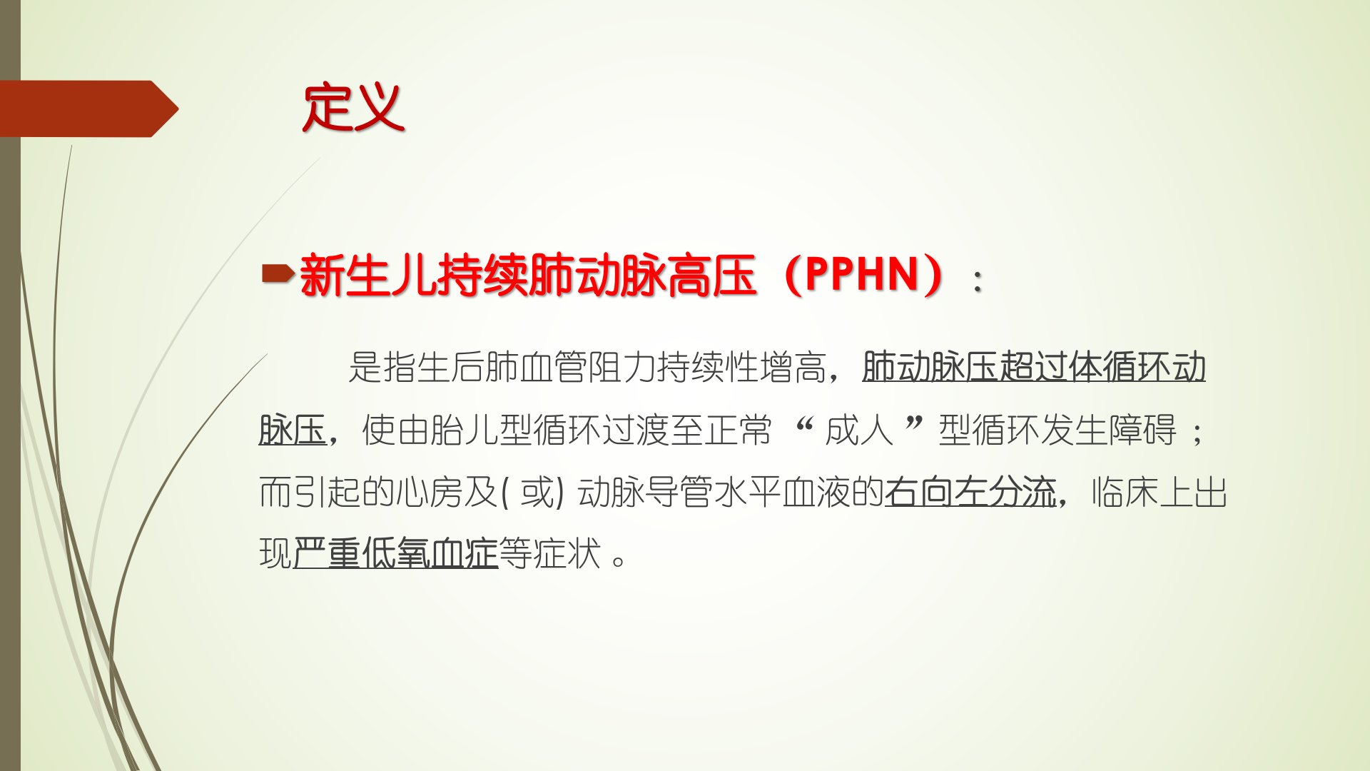 新生儿持续性肺动脉高压摘要新生儿持续性肺动脉高压(PPHN)指生后肺血管阻力持续增高肺动脉压超过体循环动脉压导致胎儿型循环向“成人”型循环过渡障碍引起心房及或动脉导管水平血液的右向左分流出现严重低氧血症等症状。病理生理与病因PPHN与肺血管异常或未扩张有关生后循环转换在PPHN发病中起重要作用。病因包括围生期窒息、肺实质性疾病、肺发育不全、肺血管数量减少、肺血管重构、心功能不全、围产期药物应用等。临床表现与诊断患儿多为足月儿生后24小时内出现发绀吸氧后一般不能缓解。诊断依据包括病史、临床表现、体格检查、动脉血气分析以及超声心动图检查后者是诊断的金标准。治疗治疗目的是降低肺血管阻力、维持体循环血压、纠正右向左分流、改善氧合。具体措施包括呼吸支持、维持最佳肺容量、目标氧合保持、维持正常体循环压力、应用血管扩张剂降低肺动脉压力以及在必要时使用ECMO。病例分享本文分享了一个典型病例患儿因生后皮肤青紫数小时入院经检查诊断为PPHN。治疗过程中使用了呼吸机辅助通气、镇痛镇静、降低肺动脉压力药物、抗感染治疗以及NO吸入等措施患儿病情逐渐好转。