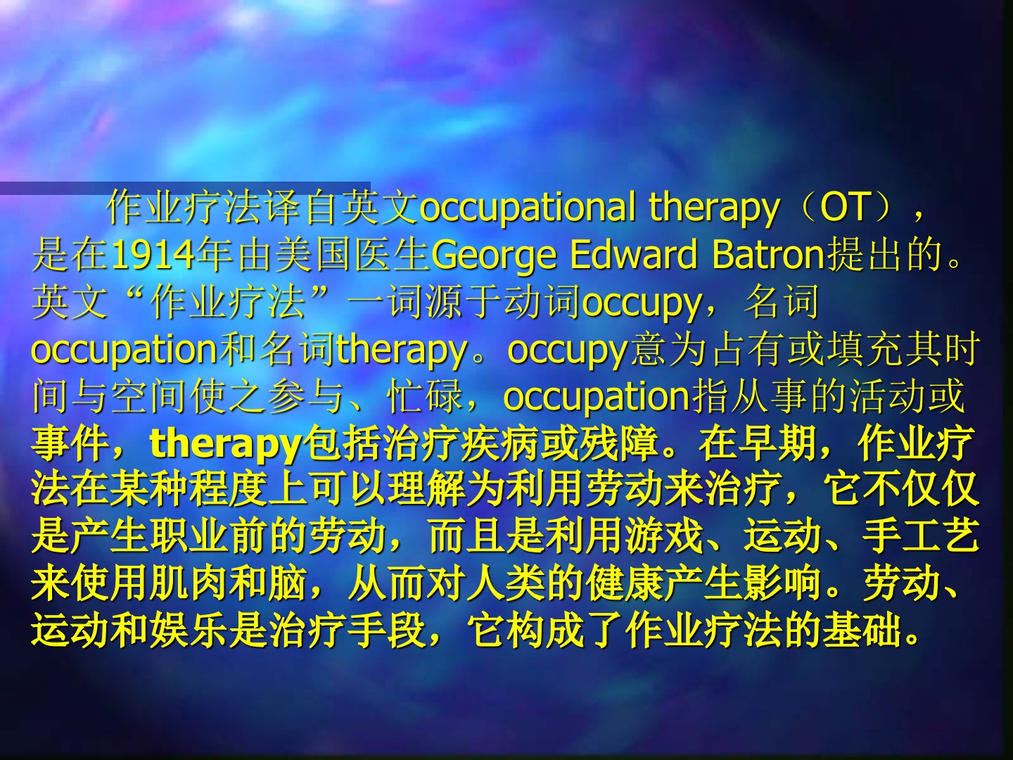 摘要本文介绍了小儿脑性瘫痪的作业疗法该疗法1914年由美国医生GeorgeEdwardBatron提出通过劳动、运动和娱乐等手段影响人类健康。一、疗法基础信息定义:不同地区定义有别但都围绕帮助人发展、重建、维持身心健康协调个案选择、安排与执行日常生活活动。分类:按作业名称、作业活动对象和性质、治疗目的和作用、实际要求有多种分类方式。对象:广义上适合康复的各种疾患狭义上有特殊或主要服务对象包括神经科、骨科等多科室疾病。治疗师职责:包括教育训练者、治疗师、指导师、职业评定者等角色。二、疗法目的与儿童特点疗法目的:增大患儿关节活动范围、改善精神心理状态、提高社会生活技能。儿童作业疗法特点:治疗—游戏—教育三结合;重视家属参与;康复辅助器具设计注重儿童发育特点。三、脑瘫功能障碍特点包括运动发育异常、异常运动模式、缺乏知觉和感觉运动体验、日常生活动作功能障碍、缺乏社会生活体验。四、疗法评定与治疗方法评定:涉及活动分析与问题处理流程、活动分析与设计、工作分析、评定内容和元素等多方面。治疗方法:促进运动功能发育、感觉知觉运动功能作业治疗、日常生活活动训练、各型脑瘫患儿日常生活动作训练、社会适应性训练