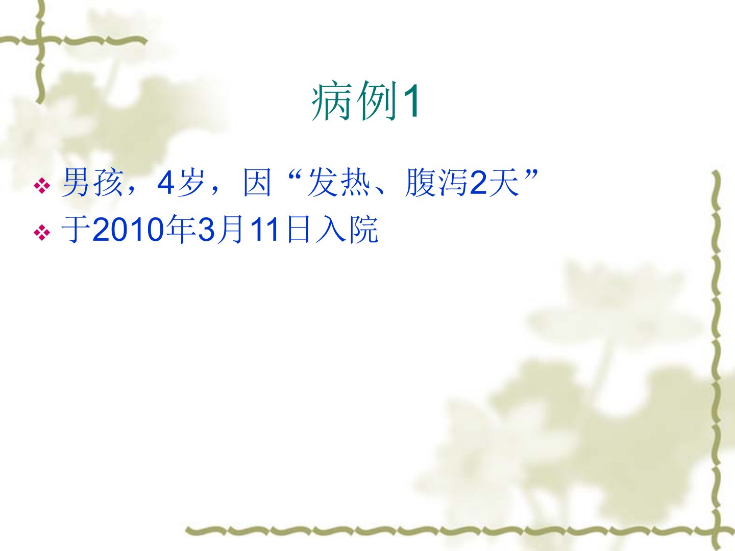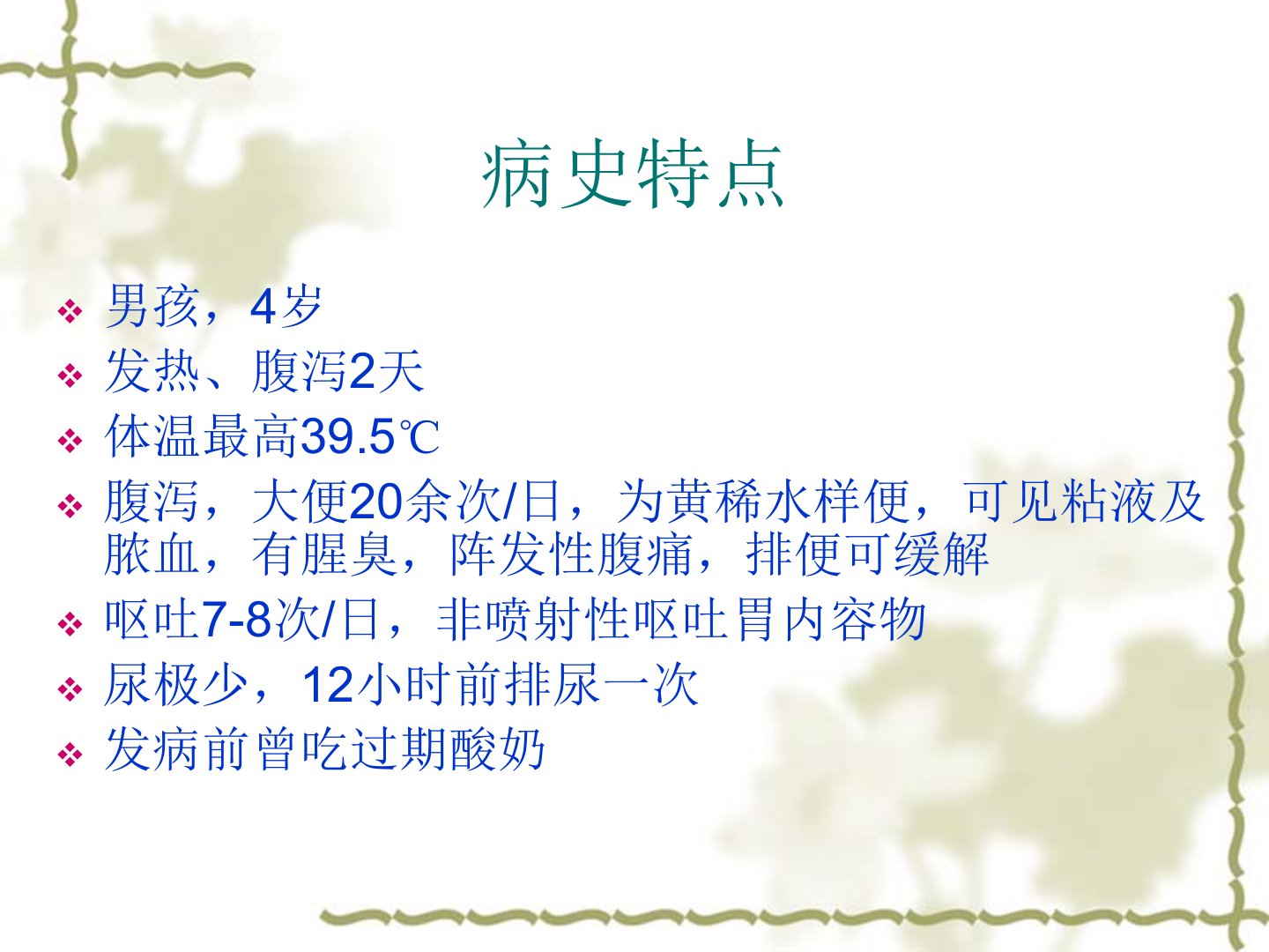 本文分享三个小儿腹泻液体疗法病例。病例1为4岁男孩因“发热、腹泻2天”入院诊断为小儿肠炎(细菌性)、重度等渗性脱水、中度代谢性酸中毒治疗采取液体疗法分累积丢失、继续丢失、生理需要三部分纠正脱水同时纠正电解质紊乱和酸中毒。病例2为10月男孩因“发热、腹泻2天”入院诊断为小儿肠炎(病毒性)、中度低渗性脱水、轻度代谢性酸中毒治疗同样采取液体疗法轻度酸中毒无需特殊治疗。病例3为2岁半女孩因“发热、腹泻1天”入院诊断为小儿肠炎(细菌性)、中度低渗性脱水、轻度代谢性酸中毒、低钾血症及可能的心肌损害治疗除液体疗法纠正脱水、电解质紊乱和酸中毒外还特别纠正了低钾血症。