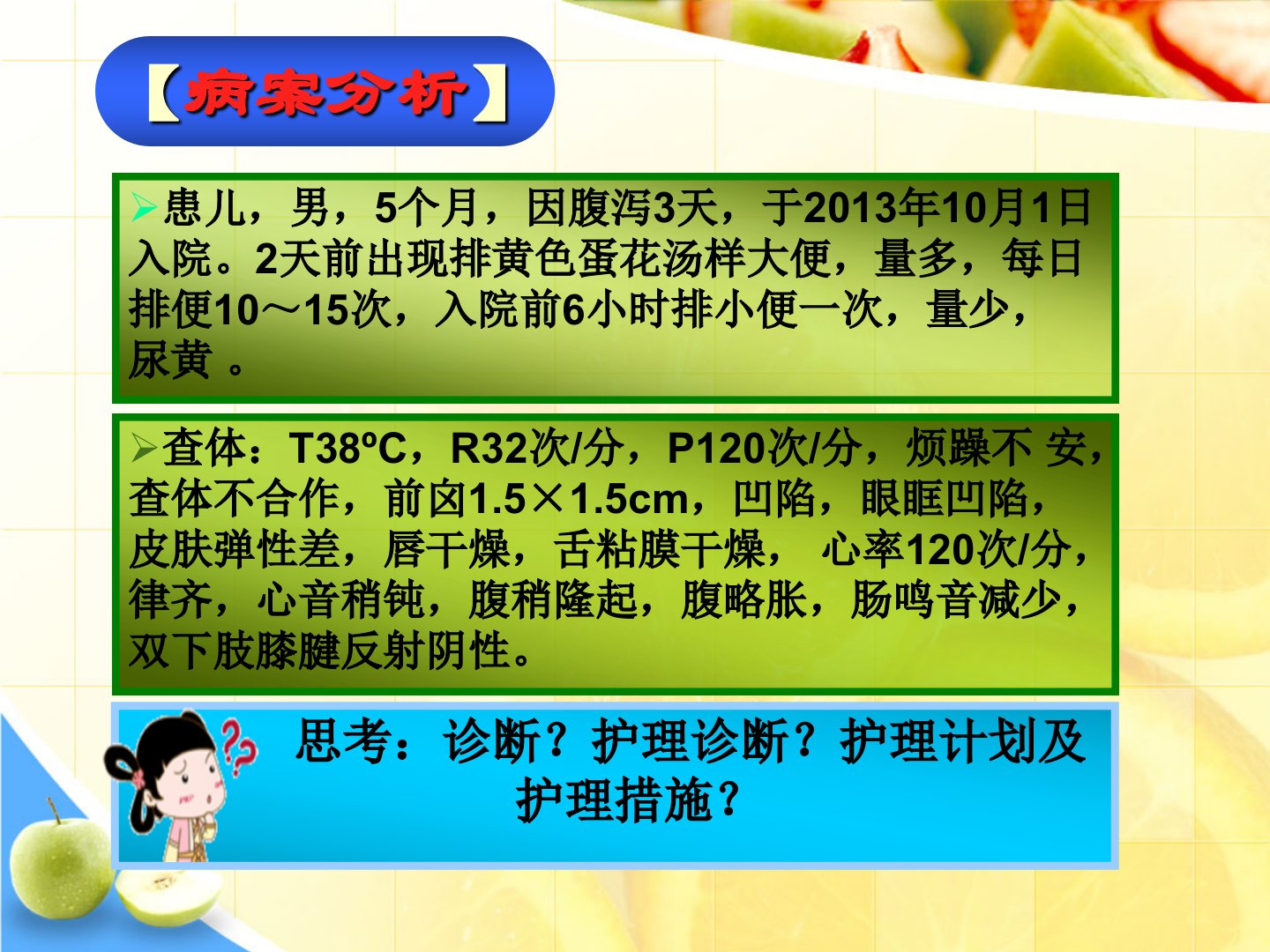 小儿腹泻病的护理思考摘要概述小儿腹泻病是导致营养不良、生长发育障碍和死亡的主因之一。病因1易感因素:消化系统发育不成熟机体防御功能差容易失水人工喂养缺乏母乳中抗感染物质。2感染因素:包括肠道内感染(病毒、细菌、真菌、寄生虫)、肠道外感染及抗生素相关性腹泻。3非感染因素:饮食不当、过敏、气候因素等。临床表现轻型腹泻:大便次数增多少量粘液无脱水及全身中毒症状。重型腹泻:全身中毒症状明显胃肠道症状严重水、电解质及酸碱平衡紊乱。治疗要点预防和纠正脱水尽早口服补液。继续喂养调整饮食。识别脱水征合理补锌。提倡母乳喂养推荐新ORS配方。护理诊断体液不足营养失调体温过高皮肤完整性受损危险知识缺乏护理措施维持皮肤完整性加强臀部护理。口服ORS液护理纠正水电解质紊乱及酸碱失衡。静脉补液护理观察输液速度和量。严格执行消毒隔离措施控制感染。密切观察病情变化监测生命体征和脱水情况。健康教育向家长解释腹泻病因、并发症及治疗措施。指导家长正确洗手处理污染物品。强调调整饮食、配制和使用ORS溶液的重要性。