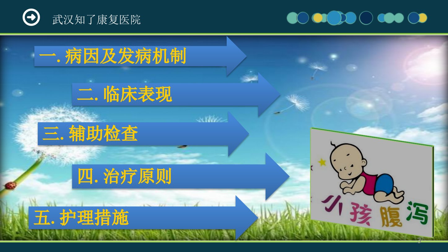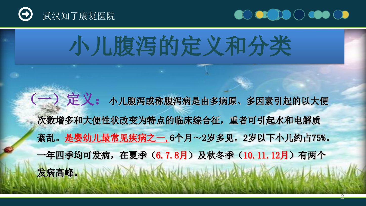 小儿腹泻的护理摘要小儿腹泻或称腹泻病是婴幼儿最常见的疾病之一多见于6个月至2岁小儿夏季和秋冬季为发病高峰。其病因多样包括感染因素(细菌、病毒与原虫等)和非感染因素(饮食不当、乳糖酶缺乏、气候突变等)。临床表现上按病程分为急性、迁延性和慢性腹泻按病情分为轻型和重型腹泻后者伴有脱水和电解质改变等症状。几种常见感染性肠炎中轮状病毒肠炎秋冬季多见大肠埃希菌性肠炎症状多样空肠弯曲菌肠炎夏季多发鼠伤寒沙门氏菌肠炎多见于2岁以下婴儿抗生素诱发肠炎多继发于大量使用抗生素后。治疗原则包括调整饮食、控制感染、纠正水和电解质紊乱、微生态疗法、粘膜保护剂应用和对症治疗。护理措施包括评估病因、记录排便情况、消毒隔离、调整饮食、补充液体、皮肤护理、观察病情、对症处理和健康指导等。
