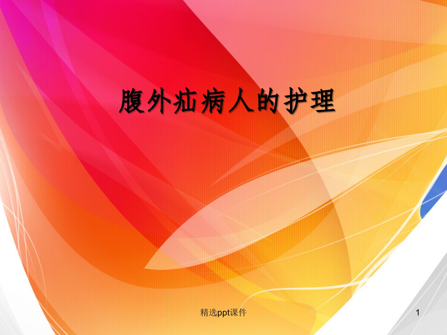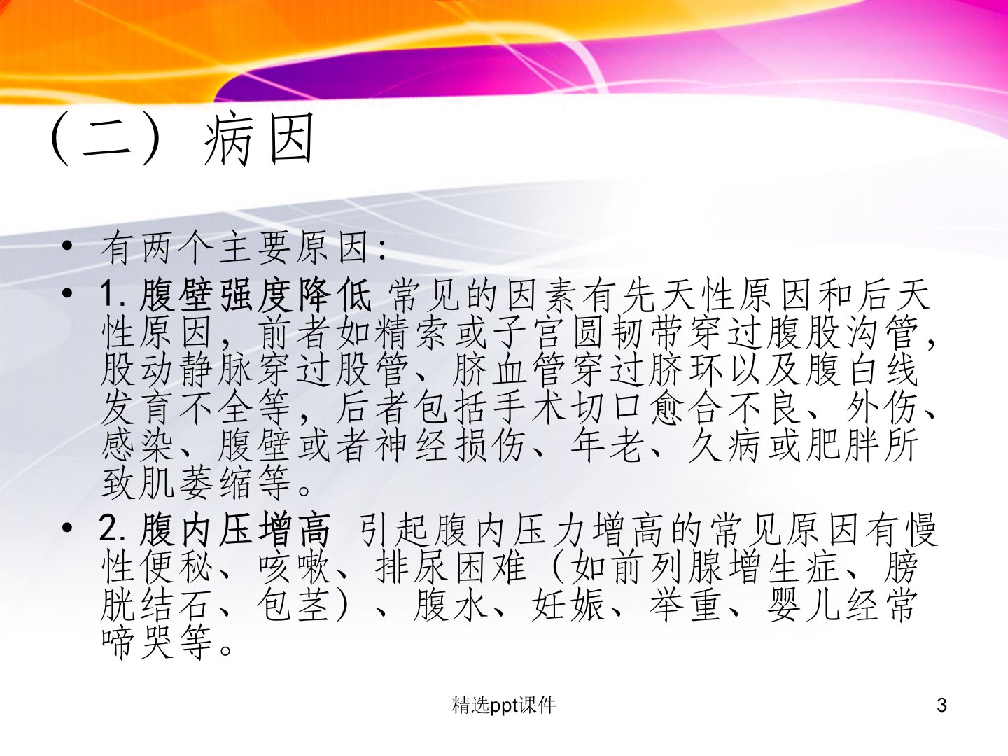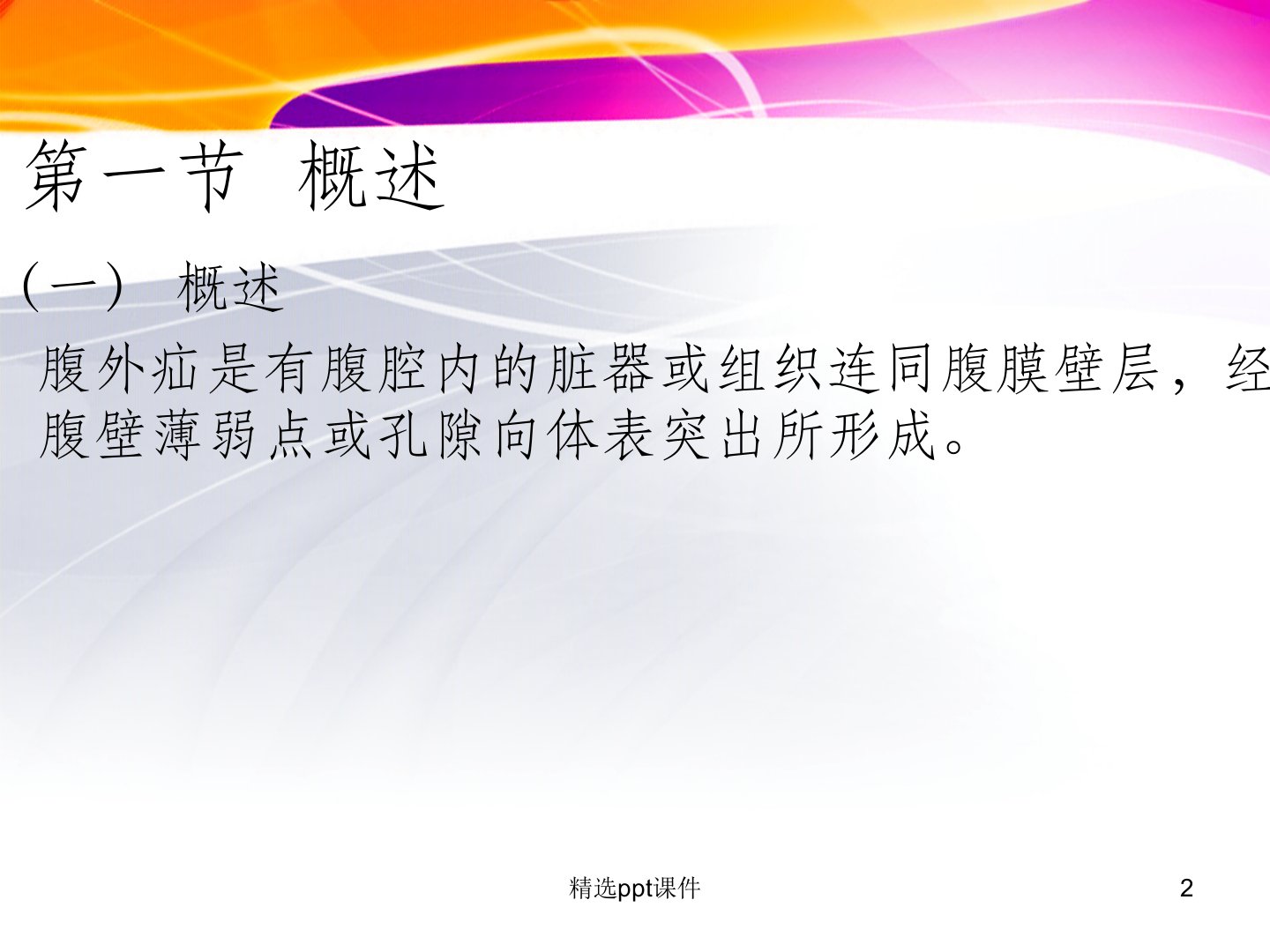 腹外疝病人的护理精选ppt课件第一节概述(一)概述腹外疝是有腹腔内的脏器或组织连同腹膜壁层,经腹壁薄弱点或孔隙向体表突出所形成。精选ppt课件(二)病因有两个主要原因:1.腹壁强度降低常见的因素有先天性原因和后天性原因,前者如精索或子宫圆韧带穿过腹股沟管,股动静脉穿过股管、脐血管穿过脐环以及腹白线发育不全等,后者包括手术切口愈合不良、外伤、感染、腹壁或者神经损伤、年老、久病或肥胖所致肌萎缩等。2.腹内压增高引起腹内压力增高的常见原因有慢性便秘、咳嗽、排尿困难(如前列腺增生症、膀胱结石、包茎)、腹水、妊娠、举重、婴儿经常啼哭等。精选ppt课件(三)病理解剖典型的腹外疝由疝环、疝囊、疝内容物和疝外...