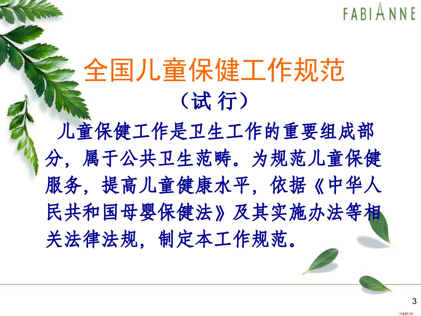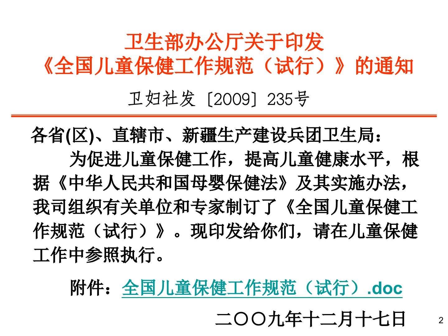 《全国儿童保健工作规范》摘要卫生部办公厅发布《全国儿童保健工作规范(试行)》以促进儿童保健工作提高儿童健康水平。该规范适用于06岁儿童服务内容包括出生缺陷筛查、生长发育监测、喂养指导、心理行为评估、免疫规划、疾病防治等。职责方面卫生行政部门负责制定方针政策、建立服务机构和网络、实施监督管理;妇幼保健机构负责制定实施工作计划、开展健康教育、技术指导和培训、信息管理、科研调查等;卫生院、社区卫生服务中心开展相应健康教育和技术服务收集上报数据;村卫生室、社区卫生服务站在指导下开展服务并上报数据;其他医疗卫生机构遵循规范接受指导评估并参与督导培训。服务内容涵盖胎儿、新生儿、婴幼儿及学龄前期儿童保健。要求服务机构须有执业许可证人员需取得执业资格并接受培训在岗人员需定期继续教育同时对业务用房和设施设备做出规定。此外规范要求建立评估制度各地每年组织实施考核评估。