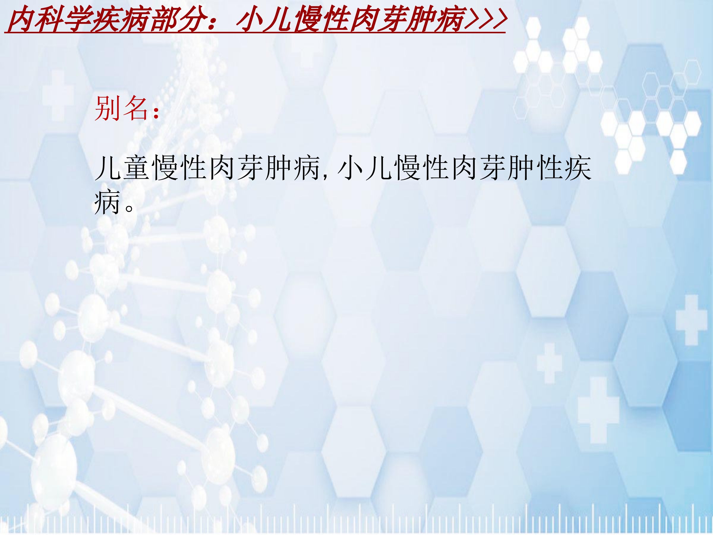 内科学各论:小儿慢性肉芽肿病摘要小儿慢性肉芽肿病别名儿童慢性肉芽肿病、小儿慢性肉芽肿性疾病属全身性疾病就诊科室为输血科和小儿科。该病是致死性遗传性白细胞功能缺陷病多在2岁以内发病少数晚至10岁以后。临床特征为吞噬细胞NADPH氧化酶缺乏活性氧、H2O2产生减少杀菌功能缺陷患者对过氧化氢酶阳性菌属高度敏感反复发生慢性细菌感染感染局部形成慢性肉芽肿。病因方面正常人吞噬细胞有依赖氧和不依赖氧两套杀菌系统CGD患者吞噬细胞NADPH氧化酶活性降低或缺乏导致依赖氧杀菌功能降低易发生反复慢性感染。发病机制与粒细胞内过氧化物杀菌力缺乏有关性联隐性遗传的慢性肉芽肿病各亚型由编码细胞色素b的基因突变引起。症状上感染通常在生后数月出现肺部感染最常见还有消化道感染、慢性鼻炎和结膜炎等脓肿可发生在机体任何部位。其他表现有胃窦狭窄引起梗阻、身材矮小等。诊断可通过四唑氮蓝实验筛查白细胞功能再结合X线检查确诊需与G6PD缺乏症等疾病鉴别。并发症包括反复严重感染、脓肿形成、阻塞以及并发红斑狼疮等。治疗重点在预防和治疗感染可用抗生素、白细胞输入、干扰素等基因治疗和骨髓移植可改善症状。预防应采取遗传病防治措施从孕前贯穿至