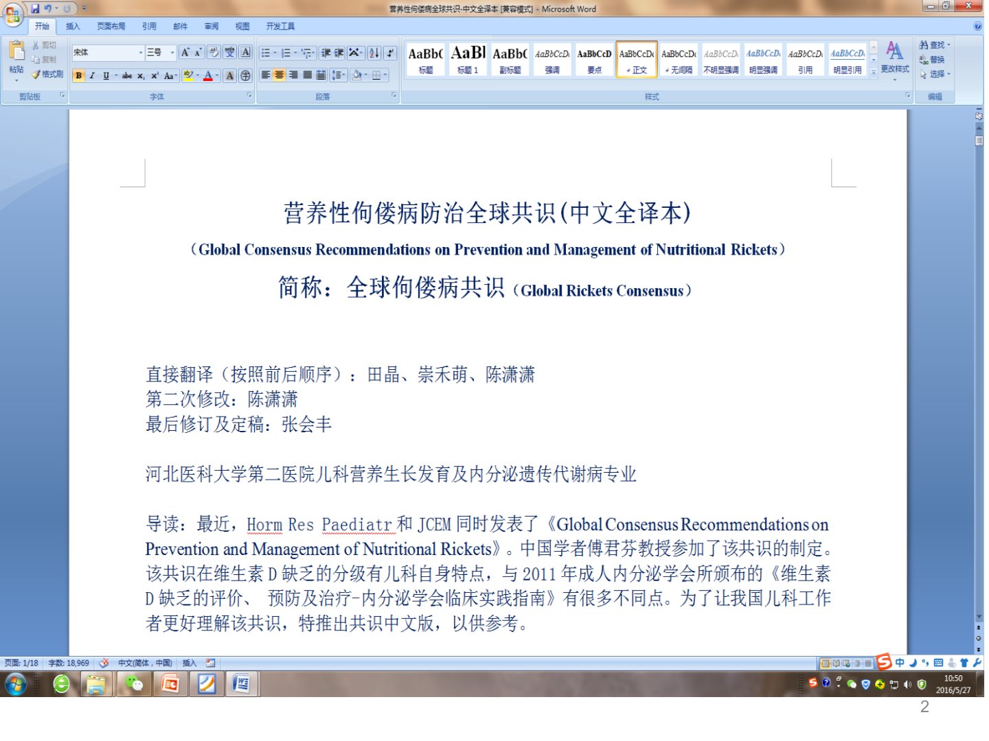 2016“营养性佝偻病全球共识”解读主要内容佝偻病概念诊断治疗预防营养性佝偻病的概念概念“营养性佝偻病(NutritionalRickets)”概念:是由于儿童维生素D缺乏和/或钙摄入量过低而导致生长板软骨细胞分化异常生长板和类骨质矿化障碍的一种疾病概念明确了“病因”强调了“病理”1986年:婴幼儿佝偻病本病是维生素D不足使体内钙、磷代谢失常钙盐不能正常地沉着在骨骼的生长部分以致骨骼发生病变同时影响神经、肌肉、造血、免疫等组织器官功能2008年-第7版《儿科学》:“营养性维生素D缺乏性佝偻病”是由于儿童体内维生素D不足使体内钙、磷代谢紊乱产生的一种骨骼病变为特征的全身慢性营养性疾病典型特征是生...