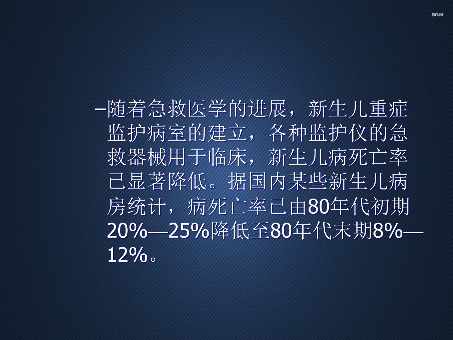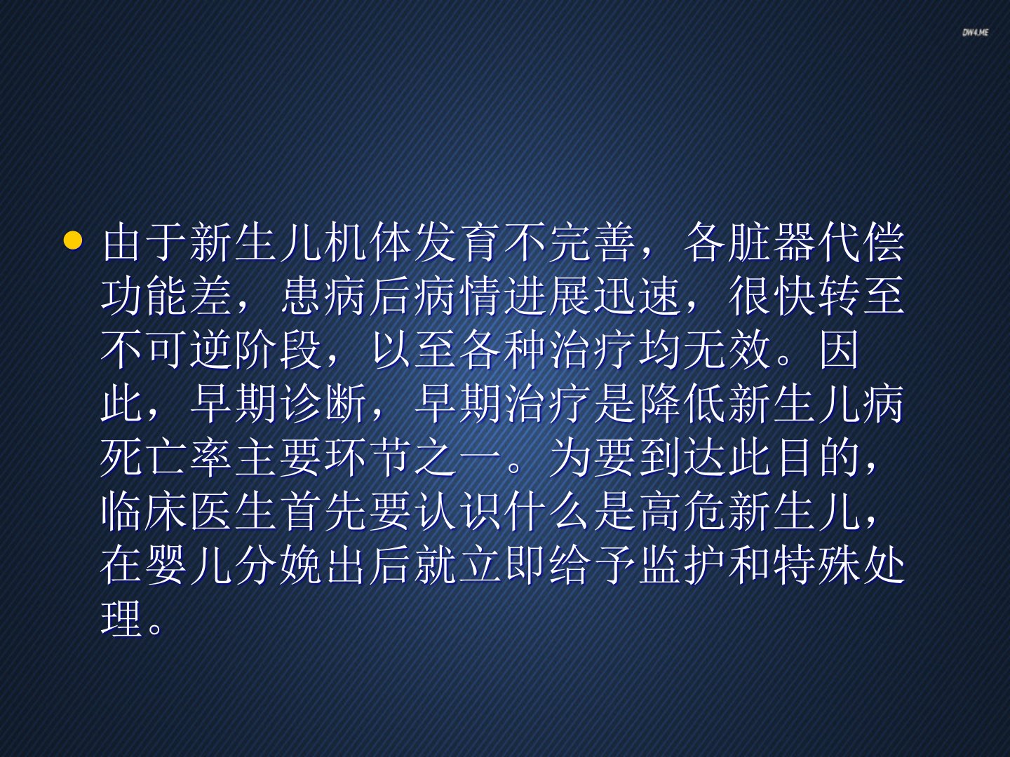 随着急救医学的进步和新生儿重症监护病室的建立新生儿病死率显著降低。由于新生儿各脏器代偿功能差病情易迅速恶化因此早期诊断和治疗至关重要。临床医生需识别高危新生儿并在出生后立即给予监护。高危新生儿包括两类一是危险性最大的婴儿如极低出生体重儿、窒息婴儿、有严重呼吸困难的婴儿及需紧急手术的先天性畸形婴儿;二是一般高危新生儿如初生窒息、产伤、神经行为异常、黄疸、贫血等婴儿。对于这两类婴儿处理方式不同前者应尽快转送至有NICU的上级医院后者则需保温、密切观察、测量血压、检测血糖、血常规及红细胞压积、定时喂奶、肌注维生素K1等。此外新生儿工作人员需详细了解围产期情况及时发现并处理可能与高危儿有关的情况。危重患儿评分表可作为判定危重程度的参考。