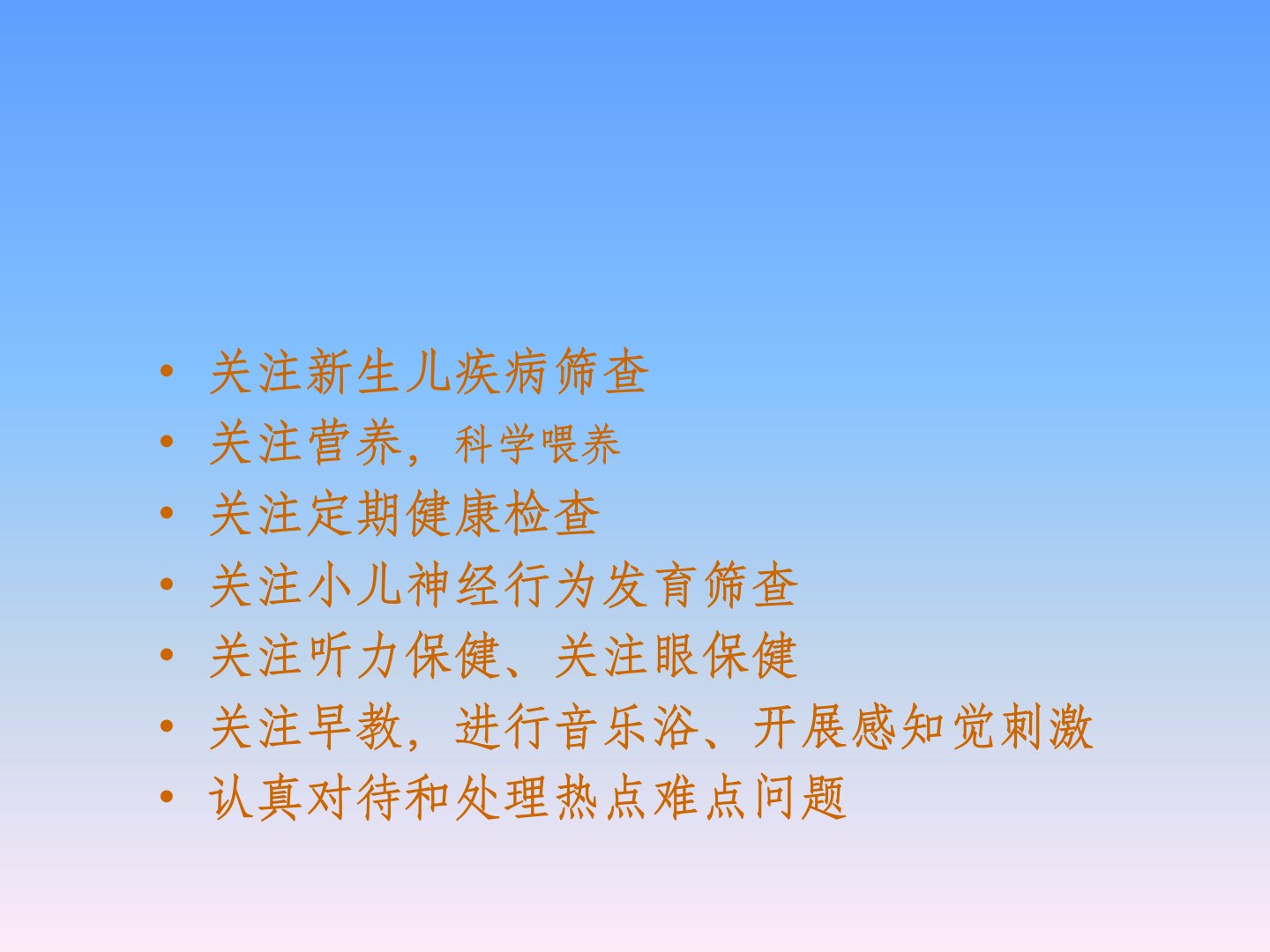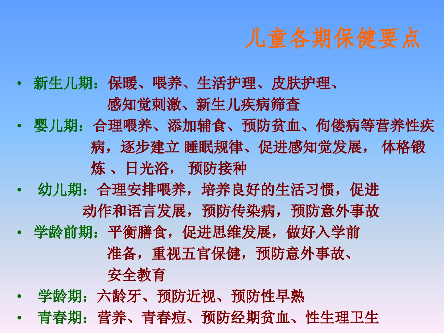 父母在孩子成长中扮演多重角色是营养、习惯和情意智商的培育者需掌握儿童生长发育监测知识了解各年龄组儿童保健要点正视现实细心养育。儿童各期保健要点包括:新生儿期注重保暖、喂养等;婴儿期合理喂养预防营养性疾病;幼儿期培养良好习惯预防传染病;学龄前期平衡膳食重视五官保健;学龄期关注六龄牙、预防近视;青春期注重营养和性生理卫生。同时需关注新生儿疾病筛查、营养科学喂养、定期健康检查、神经行为发育、听力及眼保健。早教方面可进行音乐浴和感知觉刺激以促进宝宝智力发展。此外还需关注过敏、身高、性早熟等热点问题过敏需早期预防身高需全面营养和充足睡眠性早熟需及时诊断治疗。定期健康检查能系统观察儿童状况尽早发现异常促进儿童健康成长。