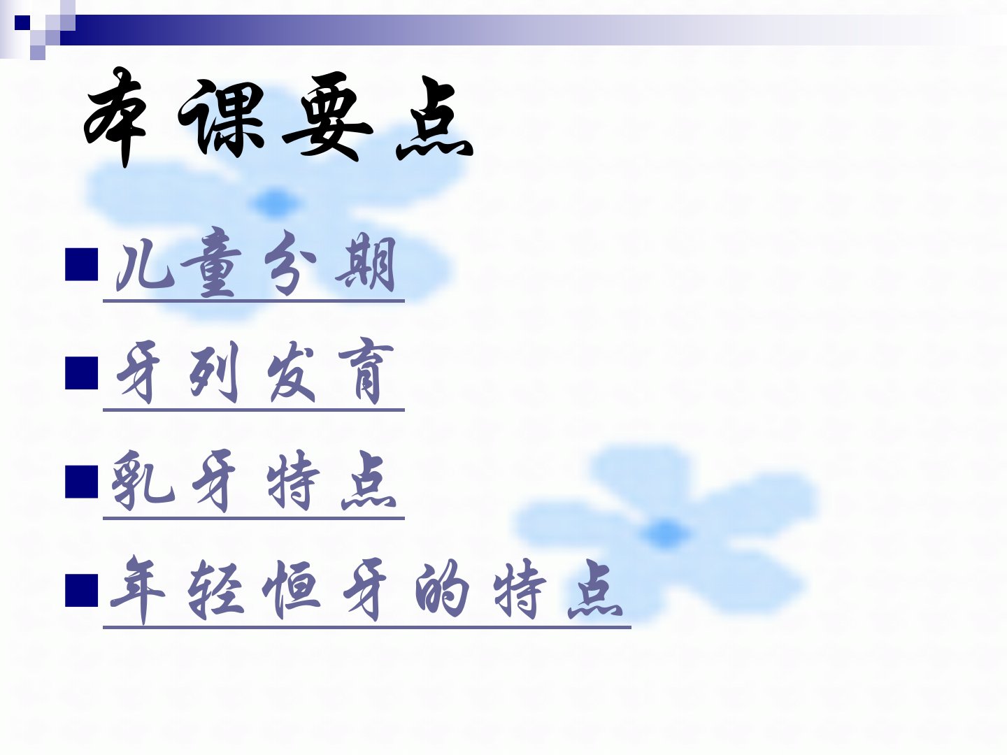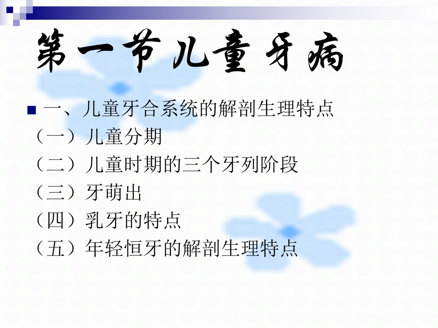 本文为口腔医学系课程要点摘要聚焦儿童牙病相关内容。首先介绍儿童牙合系统解剖生理特点涵盖儿童分期、三个牙列阶段、牙萌出等要点。其中牙萌出指牙突破口腔黏膜到与对颌牙咬合的全过程乳牙、恒牙萌出各有时间规律与口诀。乳牙特点包括牙体形态(色泽、外形、大小等)及乳恒牙鉴别要点(色泽、形态、大小等)。年轻恒牙指牙根未形成且未达平面、结构未完全成熟的恒牙特点有:牙根未形成根尖孔呈喇叭口状;硬组织薄、矿化度低、渗透性强;牙本质小管粗大牙体制备敏感;牙髓疏松未分化成分多;萌出不久磨耗少形态清晰;血管丰富、活力旺盛抗病修复能力强。课后需复习儿童分期、牙列分期等关键内容。