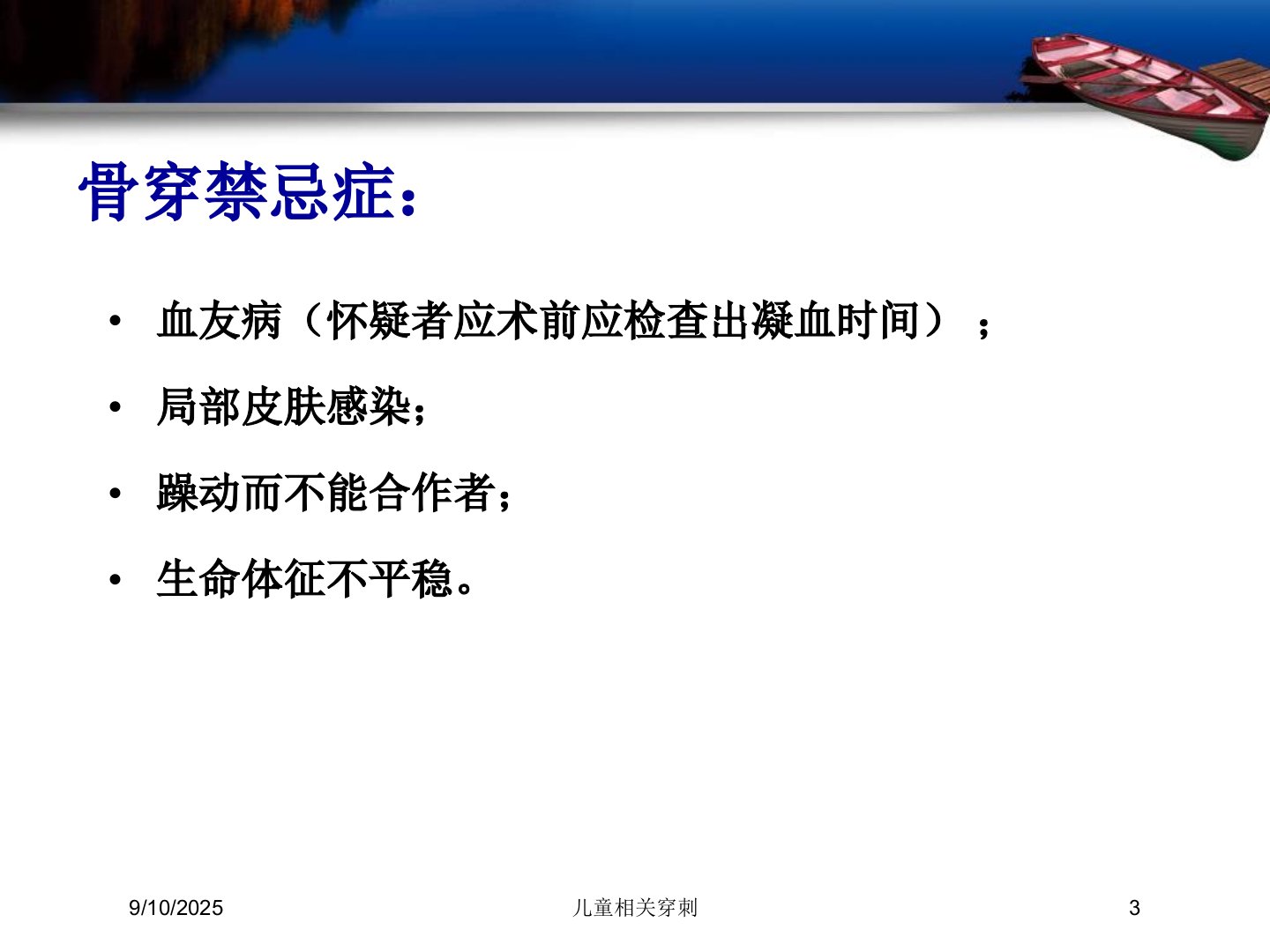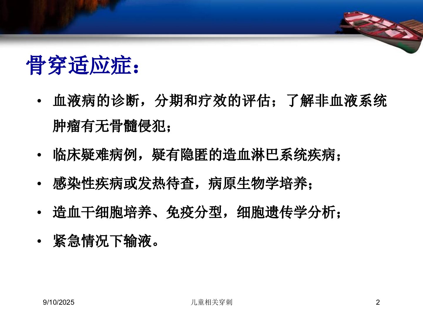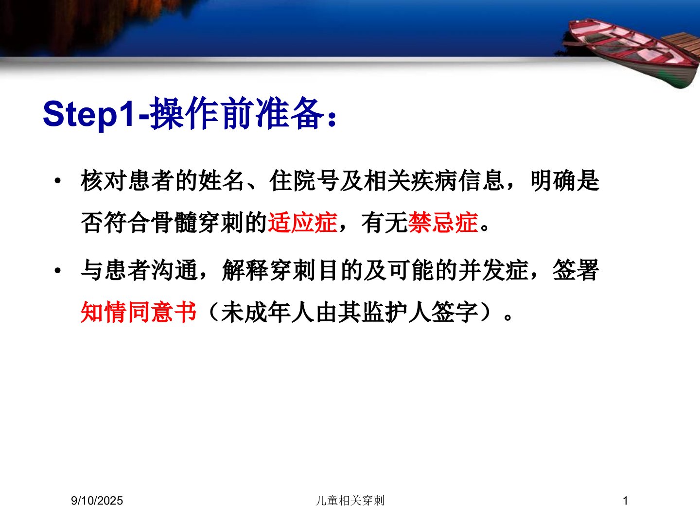 Step1-操作前准备:核对患者的姓名、住院号及相关疾病信息,明确是否符合骨髓穿刺的适应症,有无禁忌症。与患者沟通,解释穿刺目的及可能的并发症,签署知情同意书(未成年人由其监护人签字)。儿童相关穿刺骨穿适应症:血液病的诊断,分期和疗效的评估;了解非血液系统肿瘤有无骨髓侵犯;临床疑难病例,疑有隐匿的造血淋巴系统疾病;感染性疾病或发热待查,病原生物学培养;造血干细胞培养、免疫分型,细胞遗传学分析;紧急情况下输液。儿童相关穿刺骨穿禁忌症:血友病(怀疑者应术前应检查出凝血时间);局部皮肤感染;躁动而不能合作者;生命体征不平稳。儿童相关穿刺Step2-操作物品准备:准备和检查物品,包括消毒物品、骨髓穿刺...