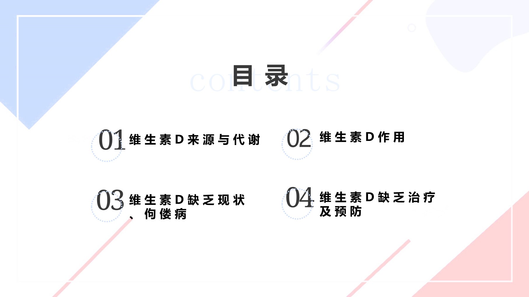 儿童时期维生素D补充contents目录维生素D来源与代谢01维生素D缺乏现状、佝偻病03维生素D作用02维生素D缺乏治疗及预防04维生素D来源与代谢PART01生长发育是一个连续、间断性的过程不同年龄段生长发育速度不同婴幼儿期(3岁以内):生长快速期,生后第1年,可增加25cm。第2年可增加10cm(第1个生长高峰)。儿童期(3岁~青春期):生长速度减缓期,每年增加5~7cm。青春期:生长加速期,男孩身高增加25~28cm,女孩身高可增加25cm作用(第2个生长高峰)生长发育存在个体差异,每个人的生长轨道不会完全相同,因此,儿童生长发育水平有一定的正常范围,而不是一个绝对值维生素来源与代谢维...