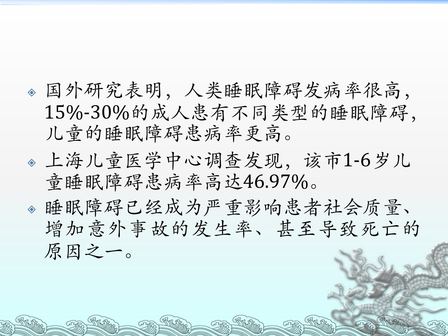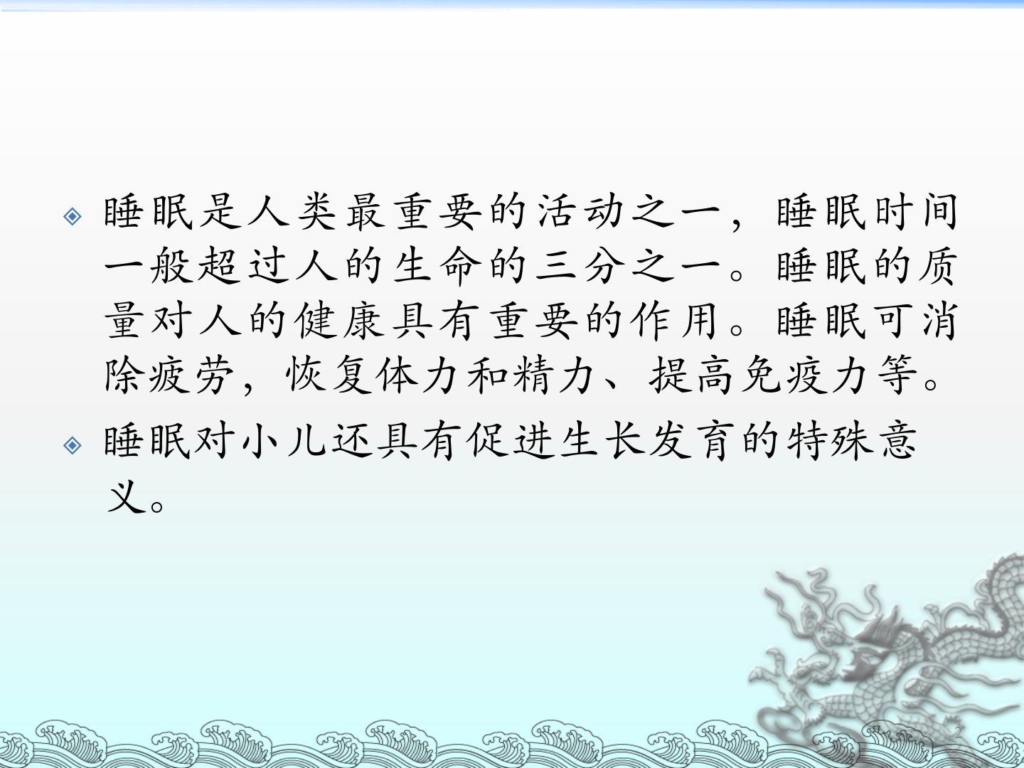睡眠是人类重要活动睡眠质量对健康至关重要。国外研究表明人类睡眠障碍发病率高儿童患病率更高已成为影响患者社会质量、增加意外事故发生率甚至导致死亡的原因之一。正常睡眠周期包括非快速动眼睡眠期(NREM)和快速眼动睡眠期(REM)。发作性睡病是一种慢性神经系统障碍病因不明有遗传易感性临床表现主要为白天过度嗜睡、入睡前幻觉、夜间睡眠紊乱、睡眠瘫痪和猝倒。诊断依据典型表现和辅助检查治疗包括药物治疗和心理治疗需长期乃至终生治疗。39例发作睡病临床分析显示误诊情况常见随诊发现患者多出现学习成绩下降、性格孤僻等问题。儿童常见的睡眠障碍还包括阻塞性睡眠暂停综合征、睡眠遗尿、梦魇、梦游和应惊等。