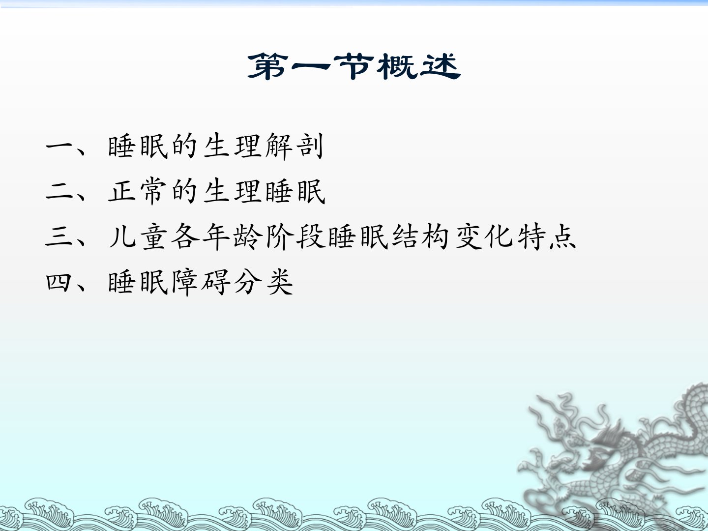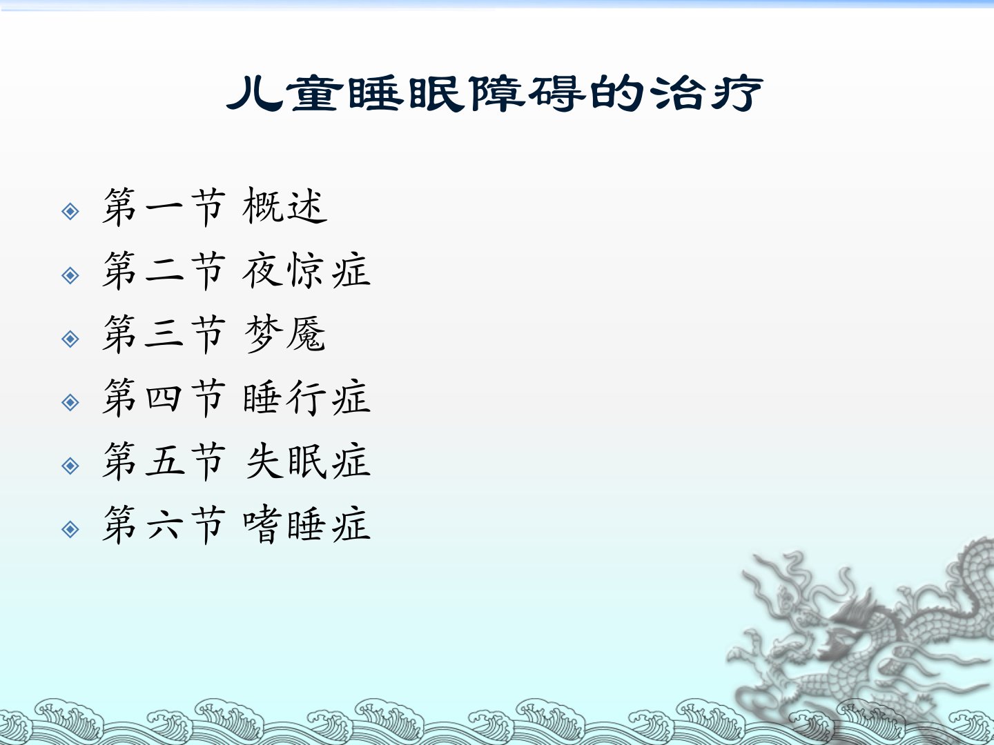 儿童睡眠障碍治疗涉及多方面。医学家经大量实验发现与睡眠有关的解剖结构广泛其中视交叉上核等在觉醒睡眠周期中有自身节律性活动的功能。正常生理性睡眠与脑结构完整及神经递质平衡密切相关睡眠分为非快速眼动(NREM)睡眠和快速眼动(REM)睡眠两相两者交替进行。儿童各年龄阶段睡眠结构有变化特点新生儿非快速眼动睡眠与快速眼动睡眠时间大致相等快速眼动睡眠总量随年龄增长逐渐减少。ICD10将睡眠障碍分为非器质性和器质性前者包括非器质性失眠症、嗜睡症等。以夜惊症为例其常见于幼儿多因遗传、心理因素等诱发常发生在非快速眼动睡眠第三四期一般无需特殊治疗可通过保持良好习惯、心理治疗、药物、针灸推拿等方式缓解。