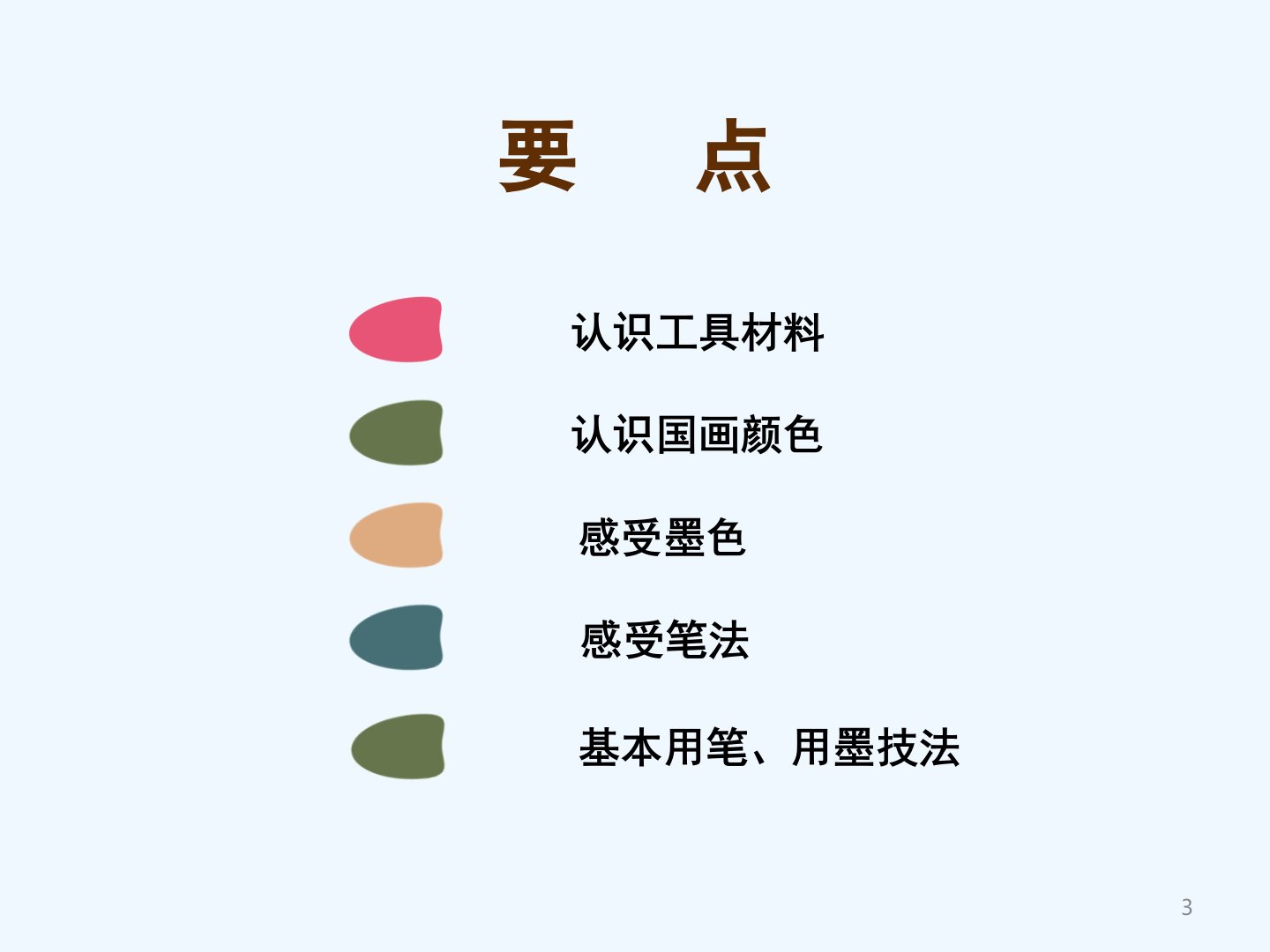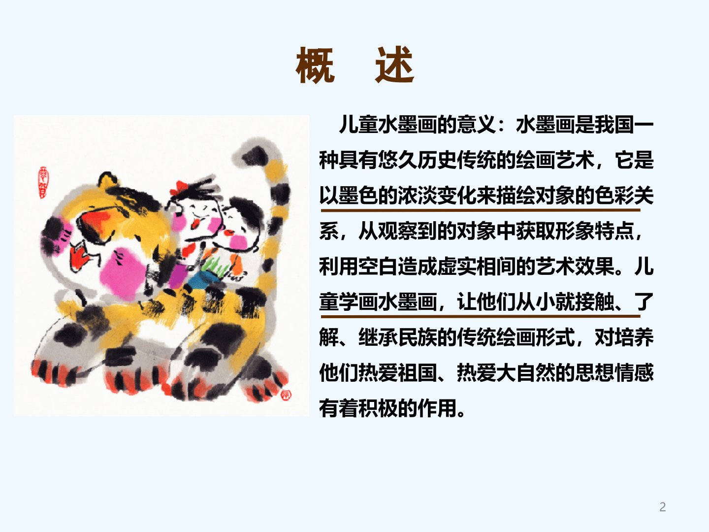 儿童水墨画第一课摘要水墨画是具有悠久历史的传统绘画艺术以墨色浓淡描绘对象色彩关系利用空白营造虚实相间的艺术效果。儿童学习水墨画有助于接触、了解并继承民族传统绘画形式培养热爱祖国与大自然的思想情感。学习儿童水墨画要点在于认识工具材料毛笔是中国独特书画工具分软毫、硬毫、兼毫;宣纸有生宣、熟宣之分;中国画颜料分透明、不透明两类;墨分油烟、漆烟和松烟还有印章、印泥等辅助工具。认识国画颜料常见12种颜色各有特性。感受墨色用墨技巧有“墨分五色”即焦、浓、重、淡、清。感受笔法用笔方法有中锋、侧锋、逆锋、散锋。基本用笔、用墨技法有破色法、勾染法、浓破法、没骨法等。最后可进行作品欣赏。