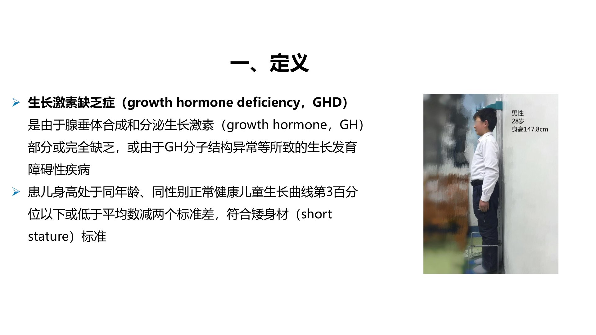 儿童生长激素缺乏症(GHD)是因腺垂体合成、分泌生长激素(GH)部分或完全缺乏或GH分子结构异常等导致的生长发育障碍。患儿身高处于同年龄、同性别正常儿童生长曲线第3百分位以下或低于平均数减两个标准差。病因包括下丘脑垂体功能障碍(原发性)、遗传性生长激素缺乏(HGHD含单纯性、多种垂体激素缺乏症及GH等受体缺陷)、继发性(多为器质性如颅内肿瘤、感染等)及暂时性(如体质性生长延迟等)。临床表现主要为匀称性身材矮小、生长缓慢、骨龄落后。诊断需结合实验室检查如GH刺激试验、IGF1测定、X线及MRI等且两种药物激发试验均示GH峰值低下才可确诊。治疗采用基因重组人生长激素(rhGH)需持续至骨骺闭合同时监测有效性和安全性。对伴有性腺轴功能障碍的患儿骨龄达12岁时可用性激素治疗。