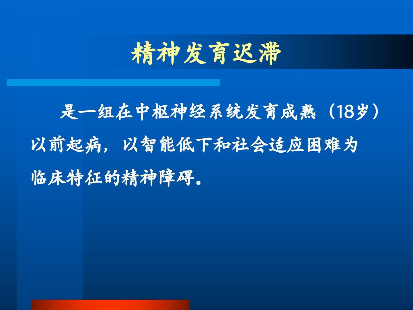 儿童少年期常见精神障碍目录精神发育迟滞二、情绪和行为障碍三、心理发育障碍精神发育迟滞是一组在中枢神经系统发育成熟(18岁)以前起病,以智能低下和社会适应困难为临床特征的精神障碍。流行病学我国调查显示智力残疾患病率1.268%,男女之比1.5:1,农村高于城市WHO报道精神发育迟滞的患病率为1%-3%病因与发病机制(一)本病的病因复杂,涉及范围广泛,生物学、环境的因素均可导致精神发育迟滞。部分精神发育迟滞患者的病因得以明确,但仍有约50%的疾病原因未能查明。1、遗传学因素:染色体异常:染色体数目和结构的改变基因异常:遗传代谢异常先天性颅脑畸形:小头畸形、先天性脑积水、脑膜膨出等病因与发病机制(二...